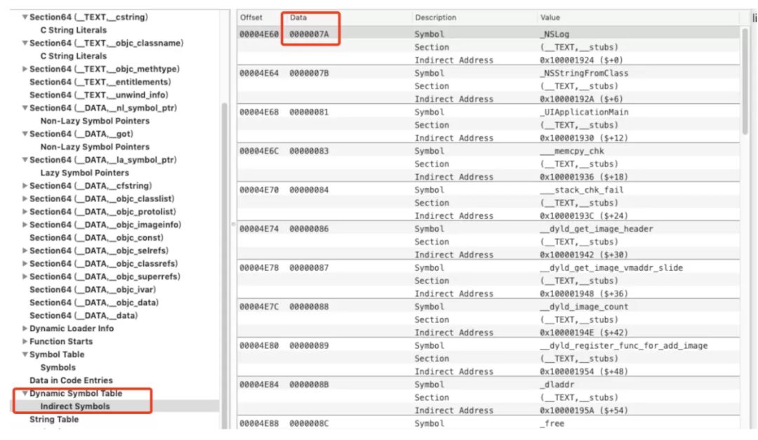 3) 在 Dynamic Symbols Table -> Indirect Symbols 表中找到 Data 值为 0x7A 的符号,其位于该表中的位置(第一个)就是它在懒加载表中对应的位置。