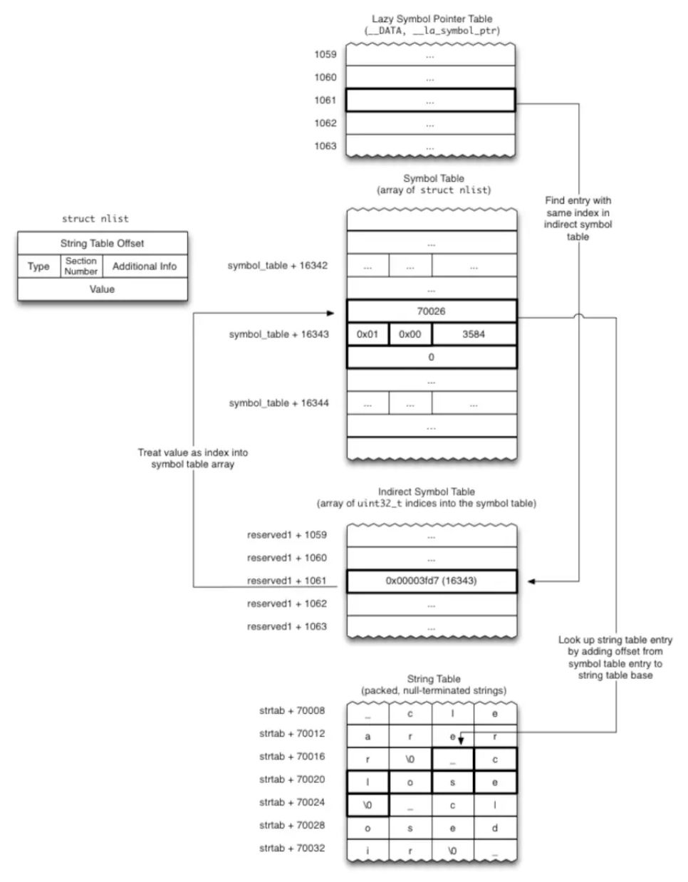 这张图其实就是讲根据一个字符串(比如 "NSLog") 如何一步步找到其在 MachO 文件里对应指针的偏移值,大致步骤如下: