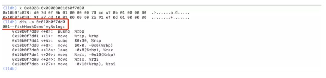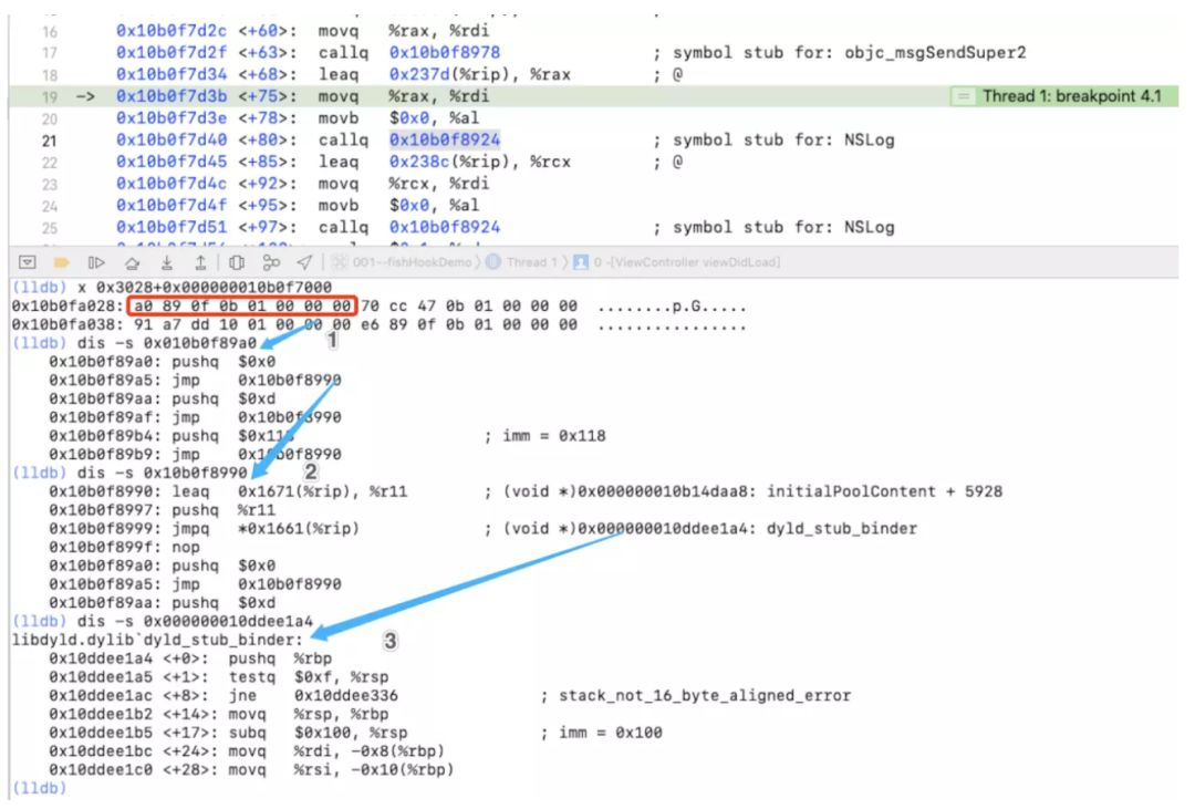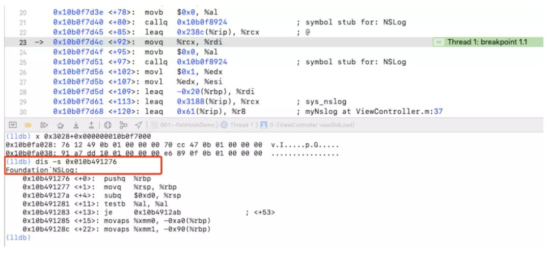 我们发现,它指向的地址由之前的 0x010b0f89a0 变为 0x010b491276 了,对应的函数也由之前的 dyld_stub_binder 变为 NSLog ,这意味着该函数的动态绑定已经完成。以上,我们验证了 iOS 的动态绑定全过程。
