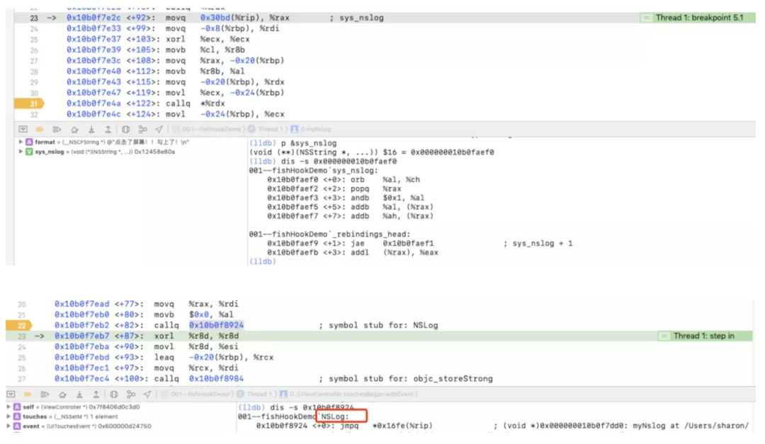 我们运行起来之后点击屏幕进入上图所示断点,查看符号表中原本指向系统 NSLog 的指针指向: