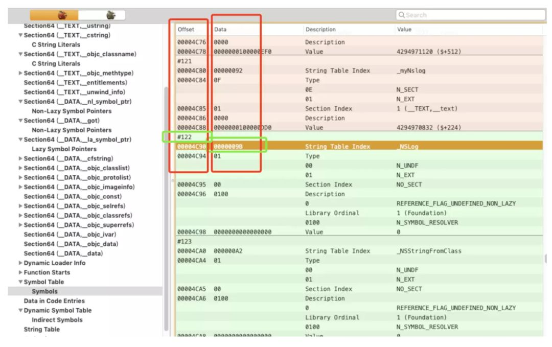 2) 在 Symbols Table -> Symbols 中找到Data = 0x9B 的符号,其对应的 offset 值 122 (0x7A) 就是该符号在 Dynamic Symbols Table -> Indirect Symbols 表中的 Data 值