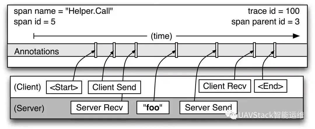 一个span可能包含来自多个主机的信息。实际上,每个RPC span都包含了来自客户端和服务端的信息。对于客户端的时间与服务端的差异,可以根据“RPC是在服务端接收到请求前由客户端发起的,针对该RPC的响应则是由服务端在客户端接收到前发出的"这一事实确定服务端响应时间戳的上下限。