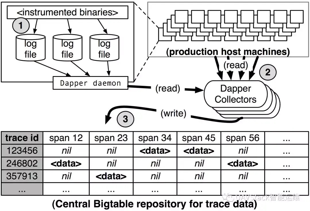 首先将span数据写入本地日志文件,然后将数据收集并写入Bigtable,每个trace记录在表中记录为一行。Bigtable的稀疏表结构非常适合存储trace记录,因为每条记录的span数量是任意的。
