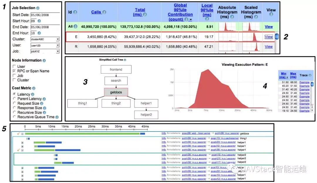 1.用户输入感兴趣的服务和时间窗口,选择相应的跟踪模式(图中为span名称)以及关心的度量参数(图中为服务延迟)