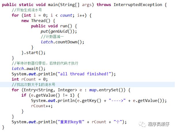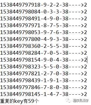 循环次数调大后,log输出已无法靠肉眼去看是否重复,需要将每个流水号出现的次数存入 Map,最后再看有多少个次数大于1的流水号。代码片段如下: