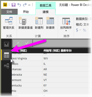 要创建计算表,首先需要转到 Power BI Desktop 中的数据视图(可从报表画布的左侧激活该视图)。