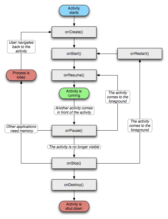 - 当Activity A开启Activity B会调用A.onPause - B.onCreate - B.onStart - B.Resume - A.onStop(视情况,当A完全不可见时会调用)