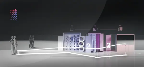 我们试着将到达市场——选择商品——确认采购的流程从现实世界映射到虚拟世界完成,利用数字化商品,打破空间的限制,给买家最方便的采购体验。所以,商品数字化设备和数字化商品体验机就应运而生了,我们用这两个设备,实现了在数字化的虚拟世界还原了用户在物理空间内的选货和购买流程。采用手势交互大屏设备作为展示数字化商品的媒介,帮助买家探索符合期望的店铺。