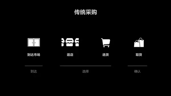 以服务设计的视角来看,用户在市场的user flow可以总结为3个步骤:到达市场——选择商品——确认采购。即为“到达——选择——确认”。我们单独分析了每一个步骤,从中发掘了一些设计点。