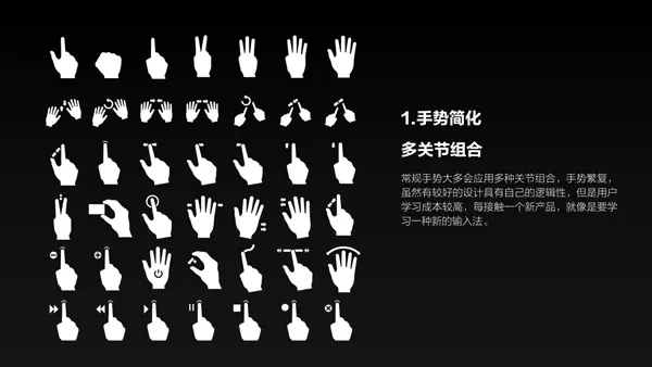 1、简化手势:手势的设计应该尽可能的简化,同时富有逻辑性,让其易学易用,并且节省体力。常规手势大多会应用多种关节组合,手势繁复,虽然有较好的设计具有自己的逻辑性,但是用户学习成本较高。每接触一个新产品,就像是要学习一种新的语言,我们不能期待用户耐心的学习一门我们自定义的语言,除非它足够简单。
