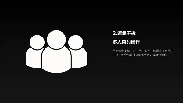 2、避免干扰:利用半封闭空间造型限制用户人数,将其他人限制在不影响操作者的位置和距离。手势识别支持一对一用户识别,在公域环境下,如果有多人干扰或者环境光线干扰,则会引起捕捉识别失败,或者误操作。