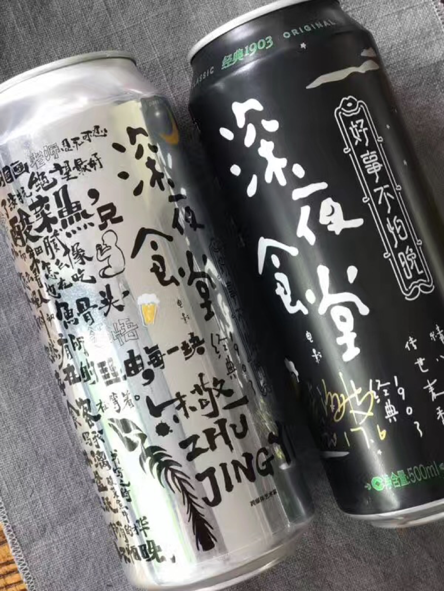 青岛啤酒故事罐上的书写是我凌晨一点,在荒郊野外且在下着雨的泥地上用半个小时完成的,之前在工作室很认真书写的版本到最后都没有用。这是一个我和酸菜鱼的故事,这是我很多年前真实经历的故事,感触良多,曾今写过一篇日记,没有想到在这个项目上用到了,其实真正有感触的事物自带强烈的感染力。