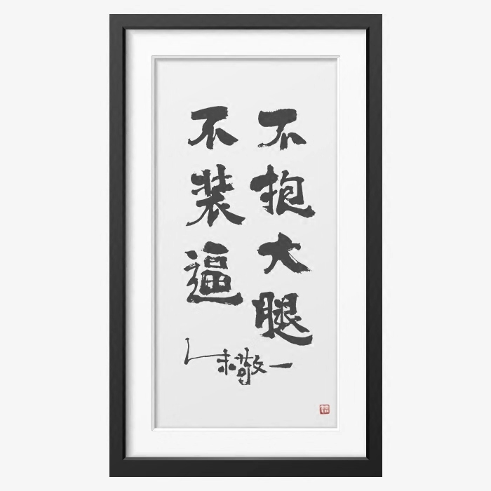 还要介绍一位给我触动的艺术家,黄永玉,我以前见过他很多的绘画作品,有一次在香港一家非常高级的日料餐厅里我看到了他写的书法,国画专业的他写了一些很调侃的话。我当时觉得很有感触,原来写书法能够不用那么一本正经,不用那么端着,可以小玩味,小自在。他们两位让我解下了书法教育夹在头上的紧箍咒。真的把这些放下的时候,就会发现世界在你面前打开了一道大门,因为你可以没有规则,可以没有好坏的概念,因此同样的字我从来不写第二遍。