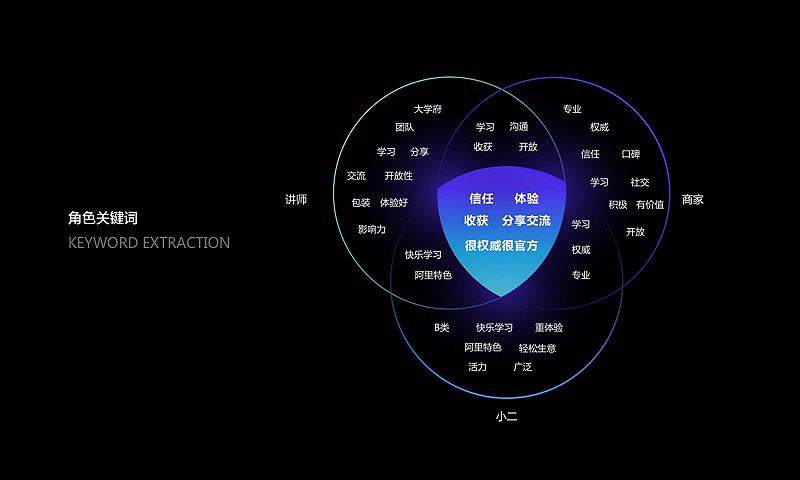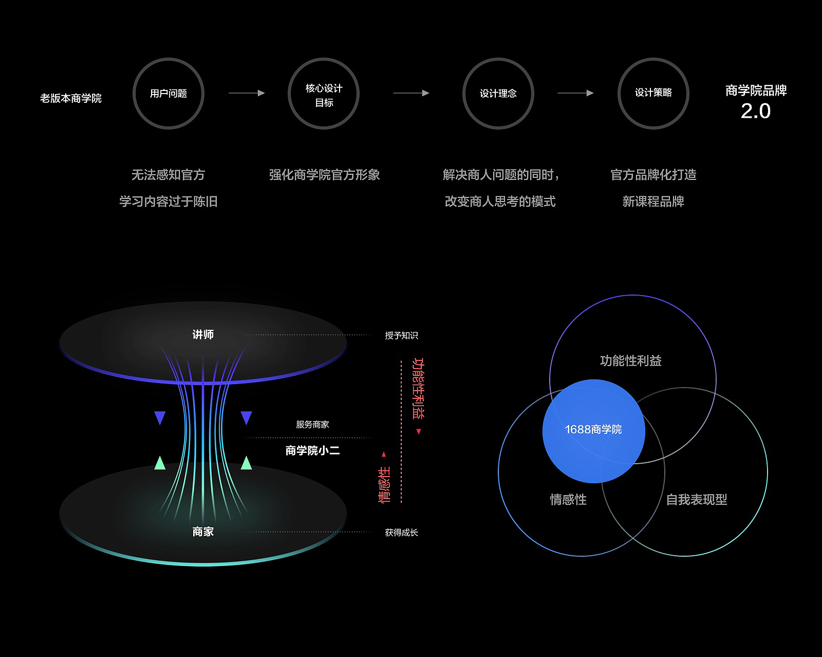 “商学院不只解决你的问题,更在改变你的商人思维模式” ,这是我们与业务方探讨之后得出的设计理念。我们通过商学院的用户关系找到了商学院品牌价值的定位,最终将品牌价值定位在功能利益型和情感类两大类,并将重心倾向于情感性。