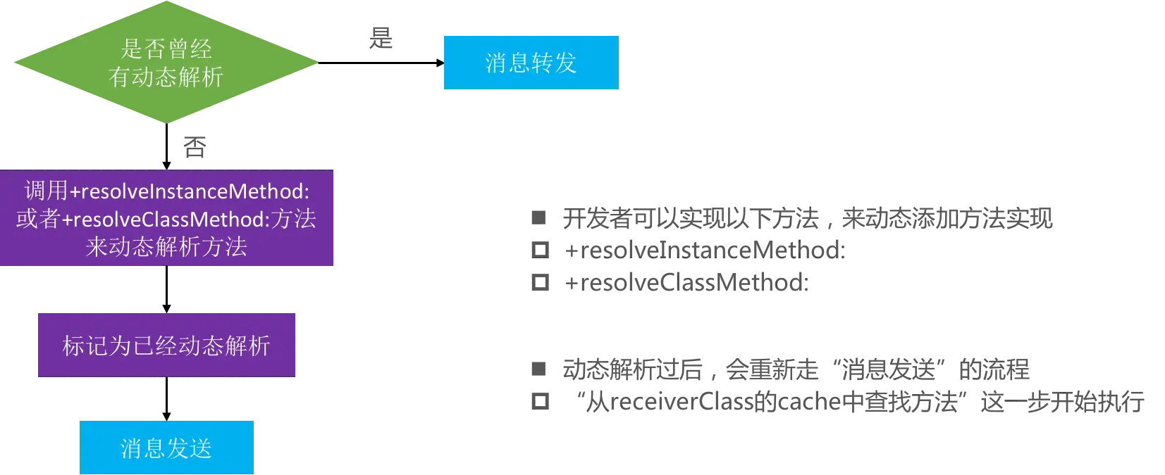 objc_msgSend中, 一共可以分为三个阶段: 消息发送、动态方法解析、消息转发