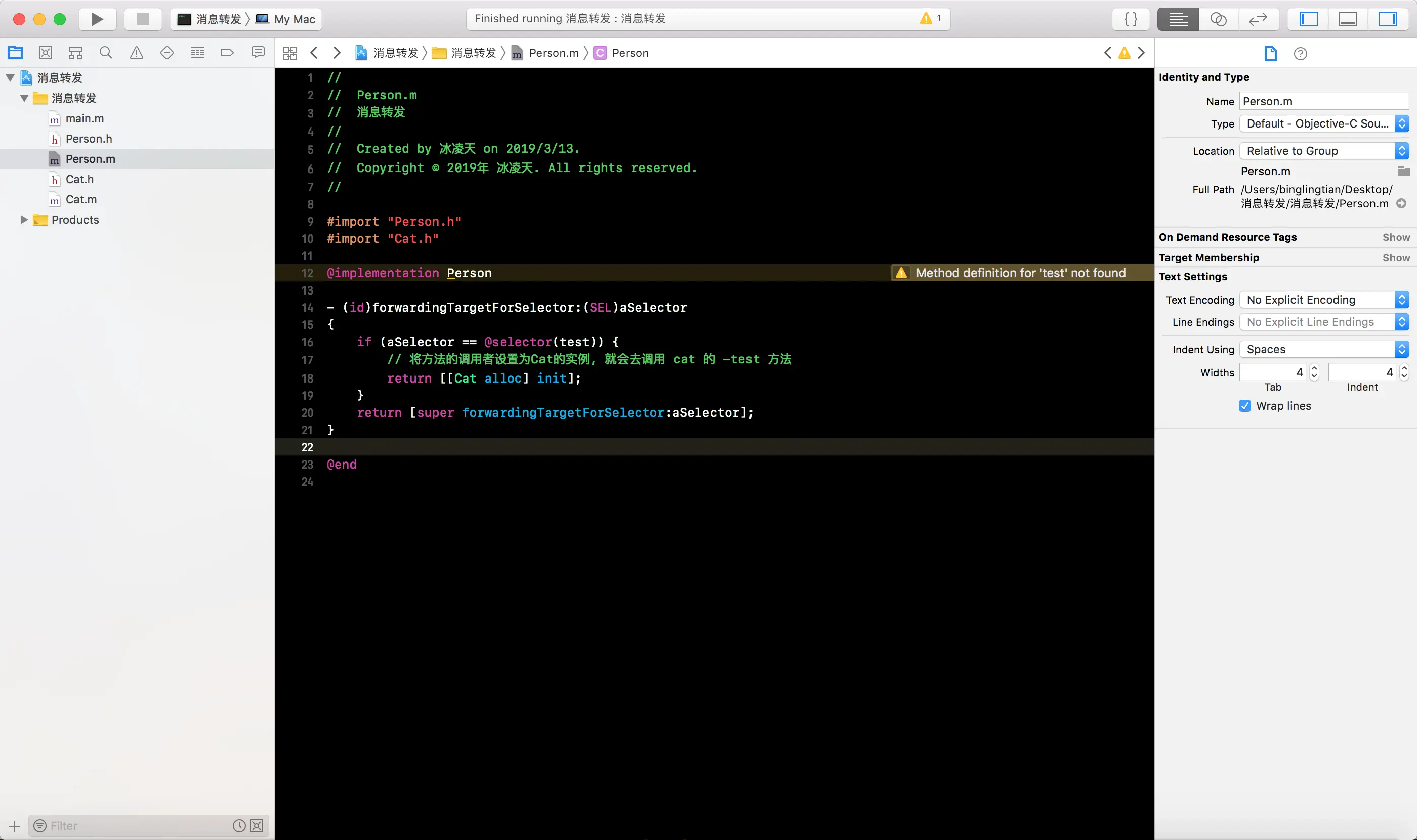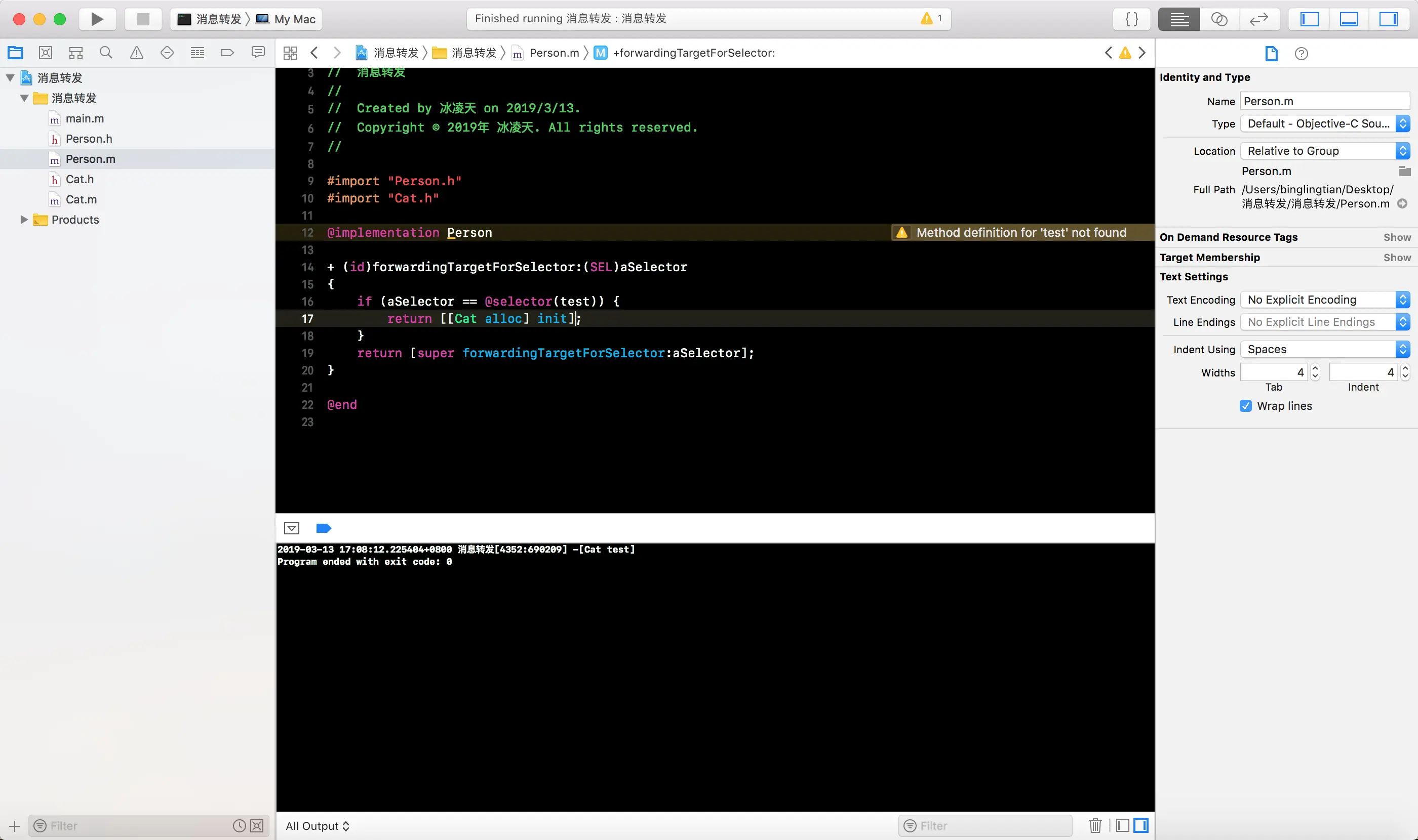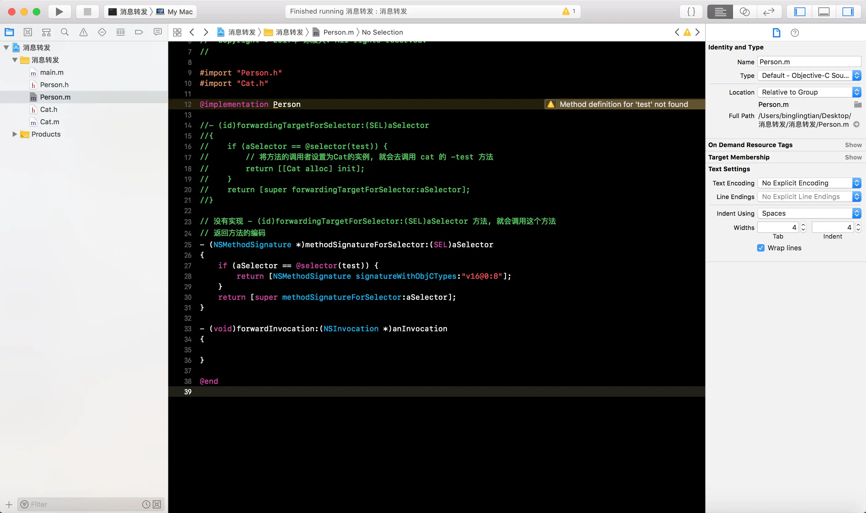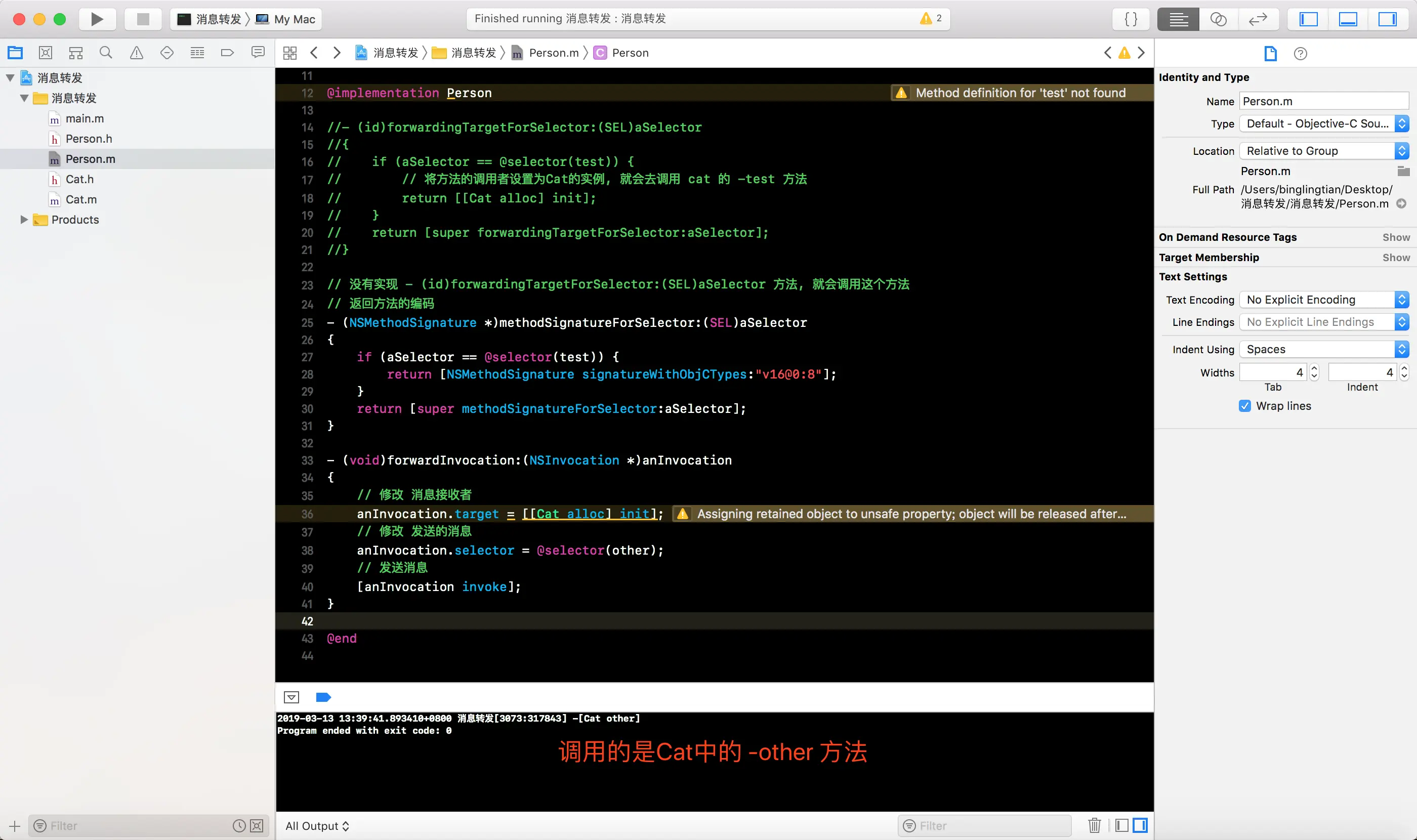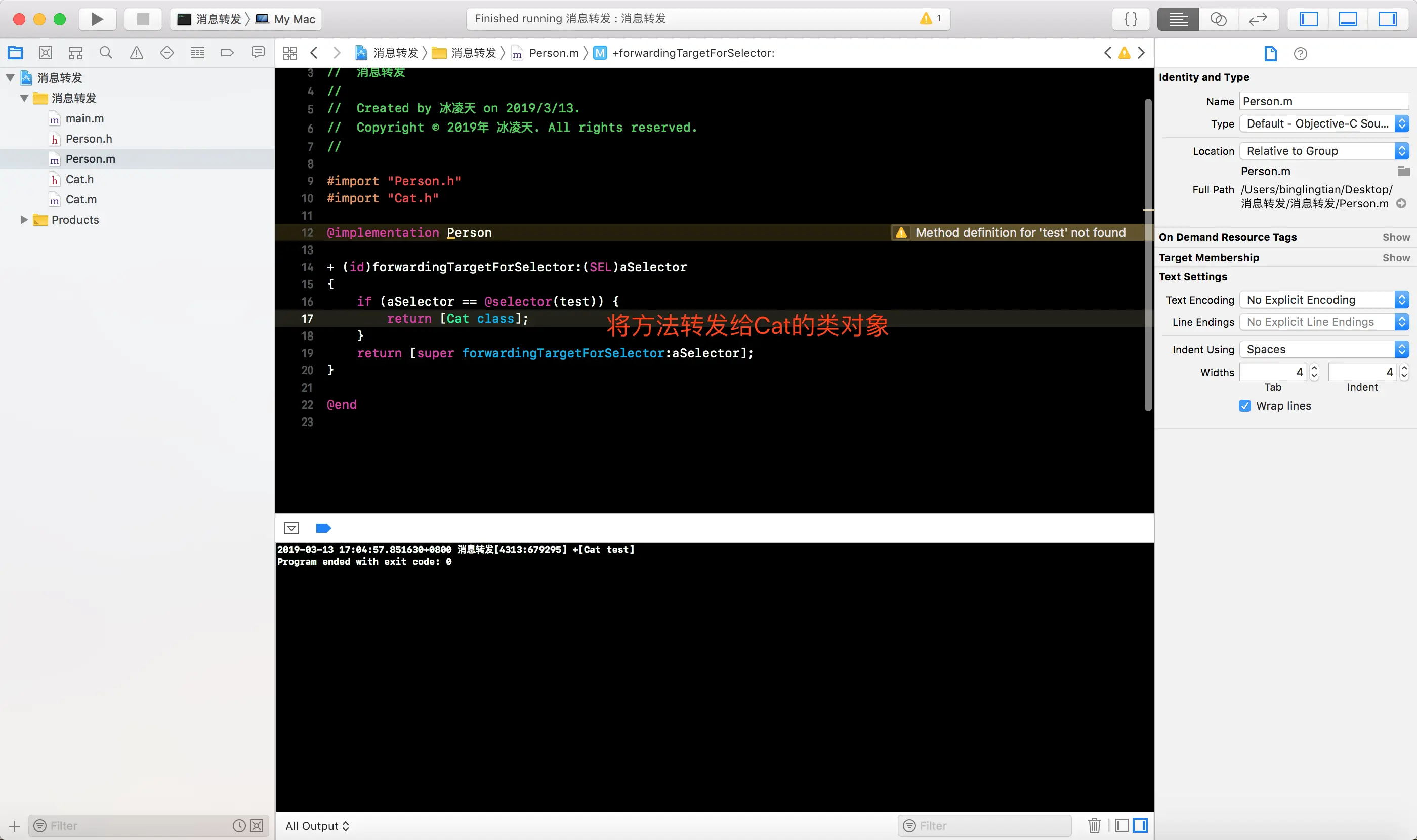 -forwardingTargetForSelector:方法, 将消息接收者编程Cat的一个实例对象, 这样就会白test消息转发给Cat实例对象