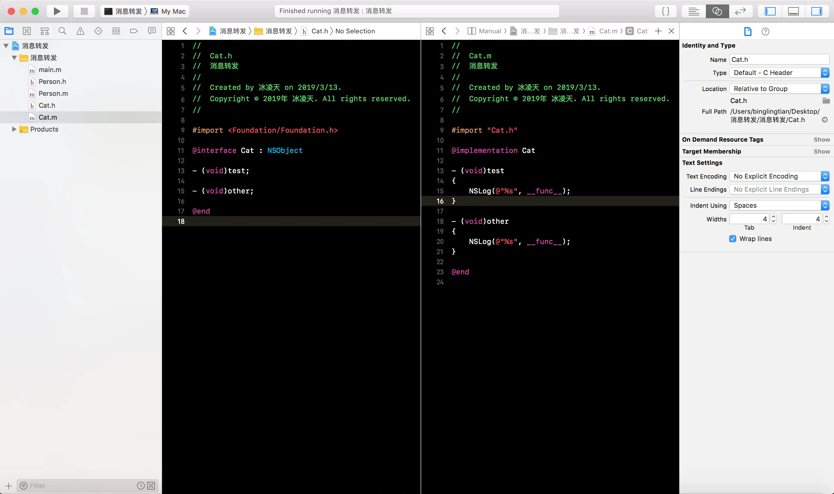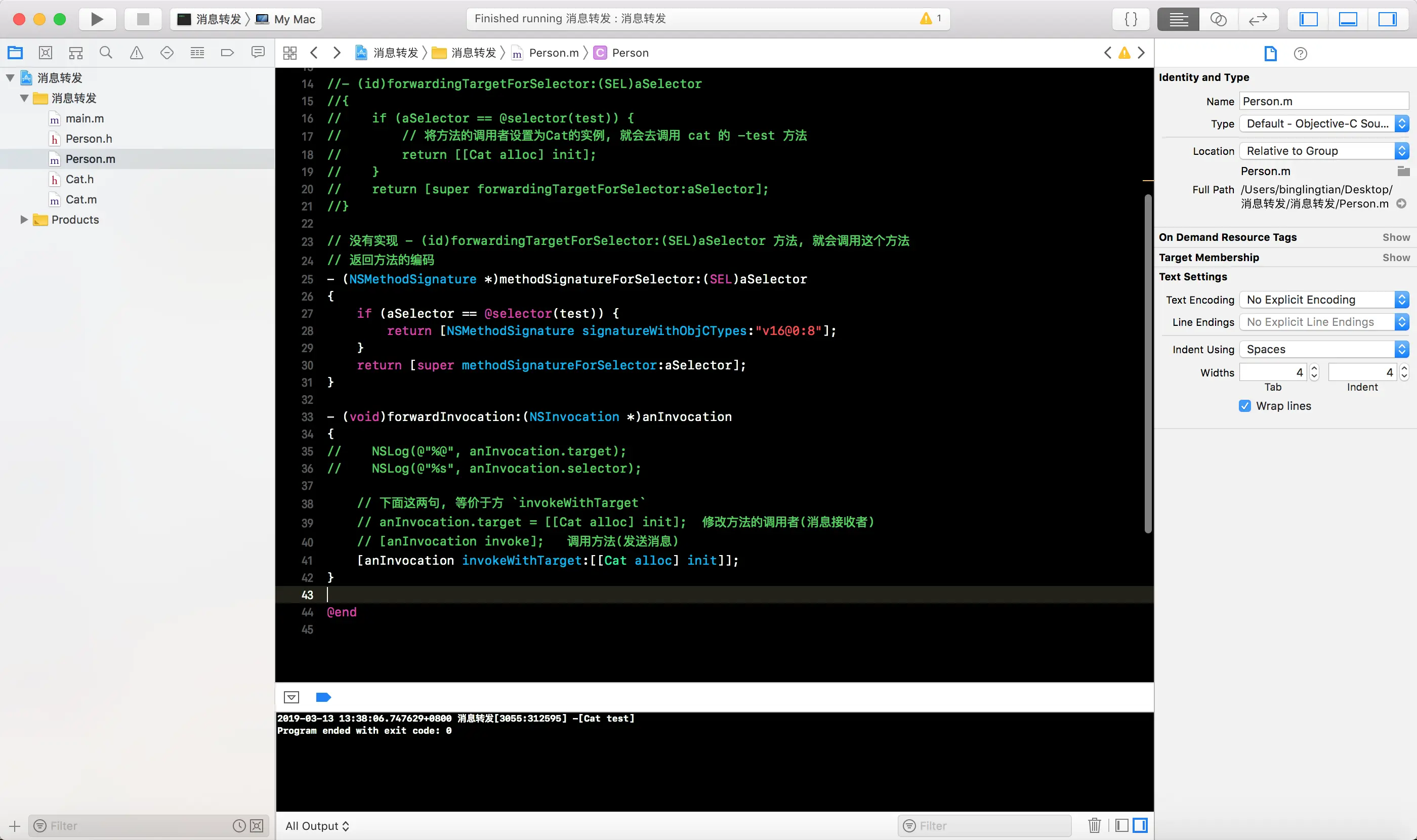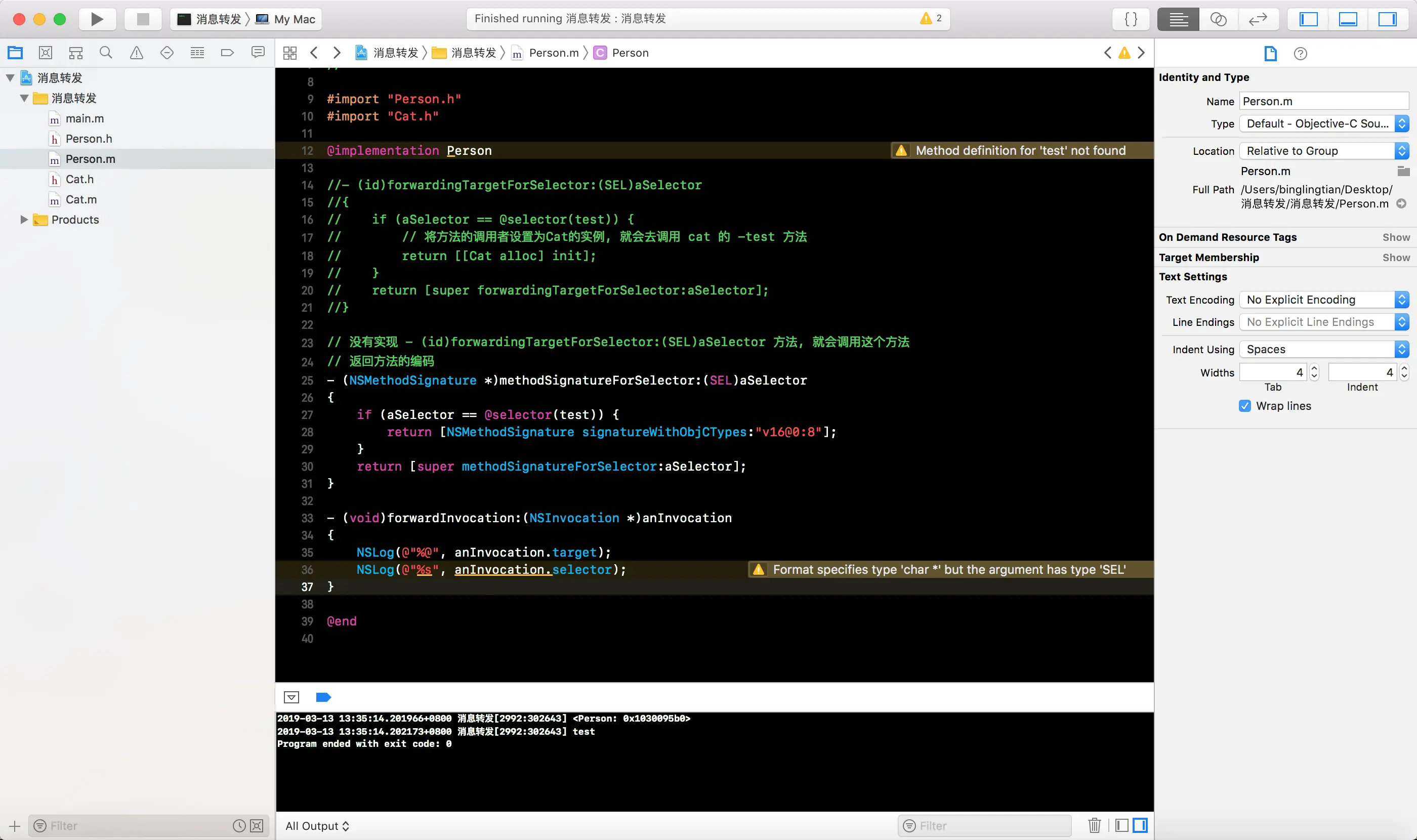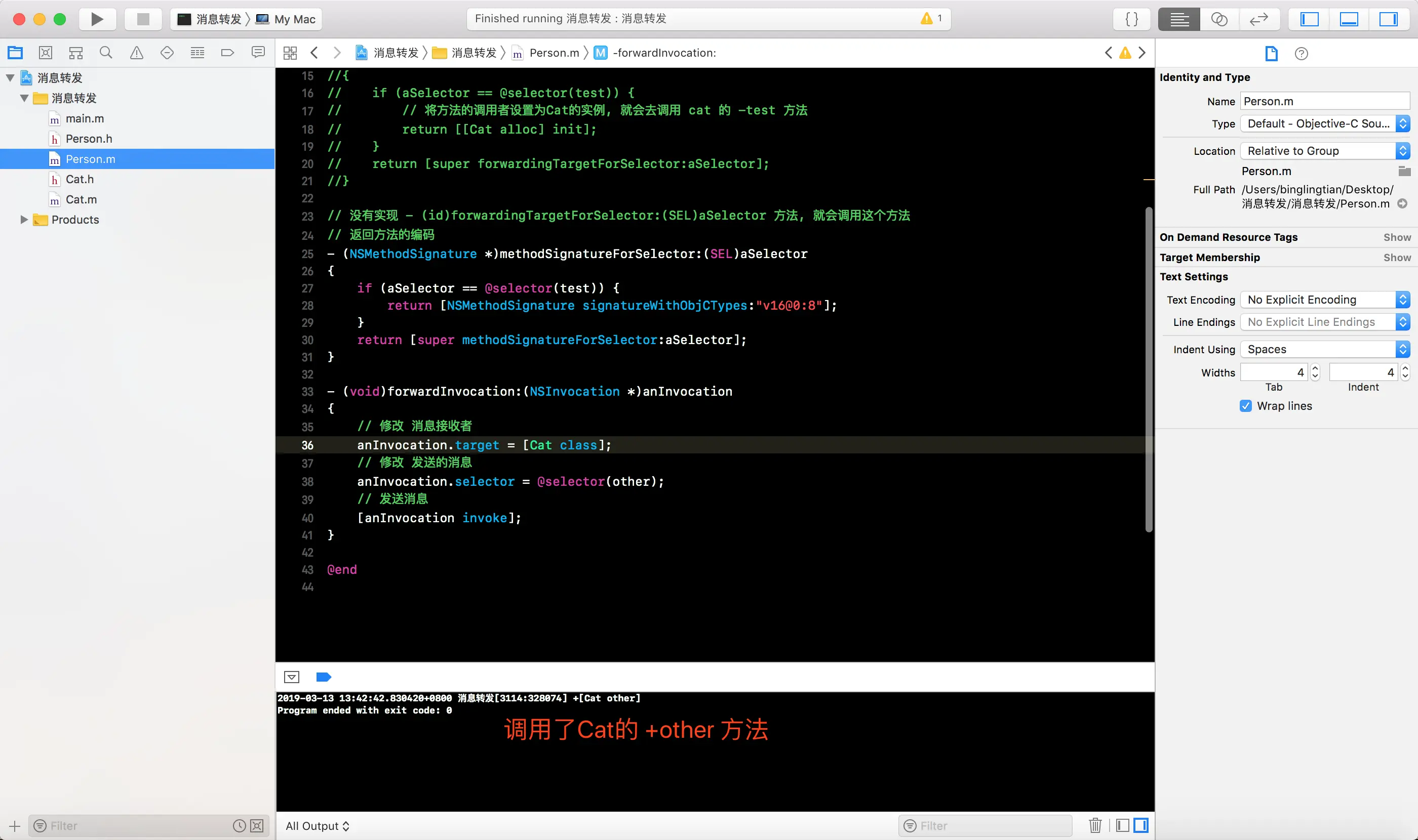-forwardingTargetForSelector:方法, 将消息接收者编程Cat的一个实例对象, 这样就会白test消息转发给Cat实例对象