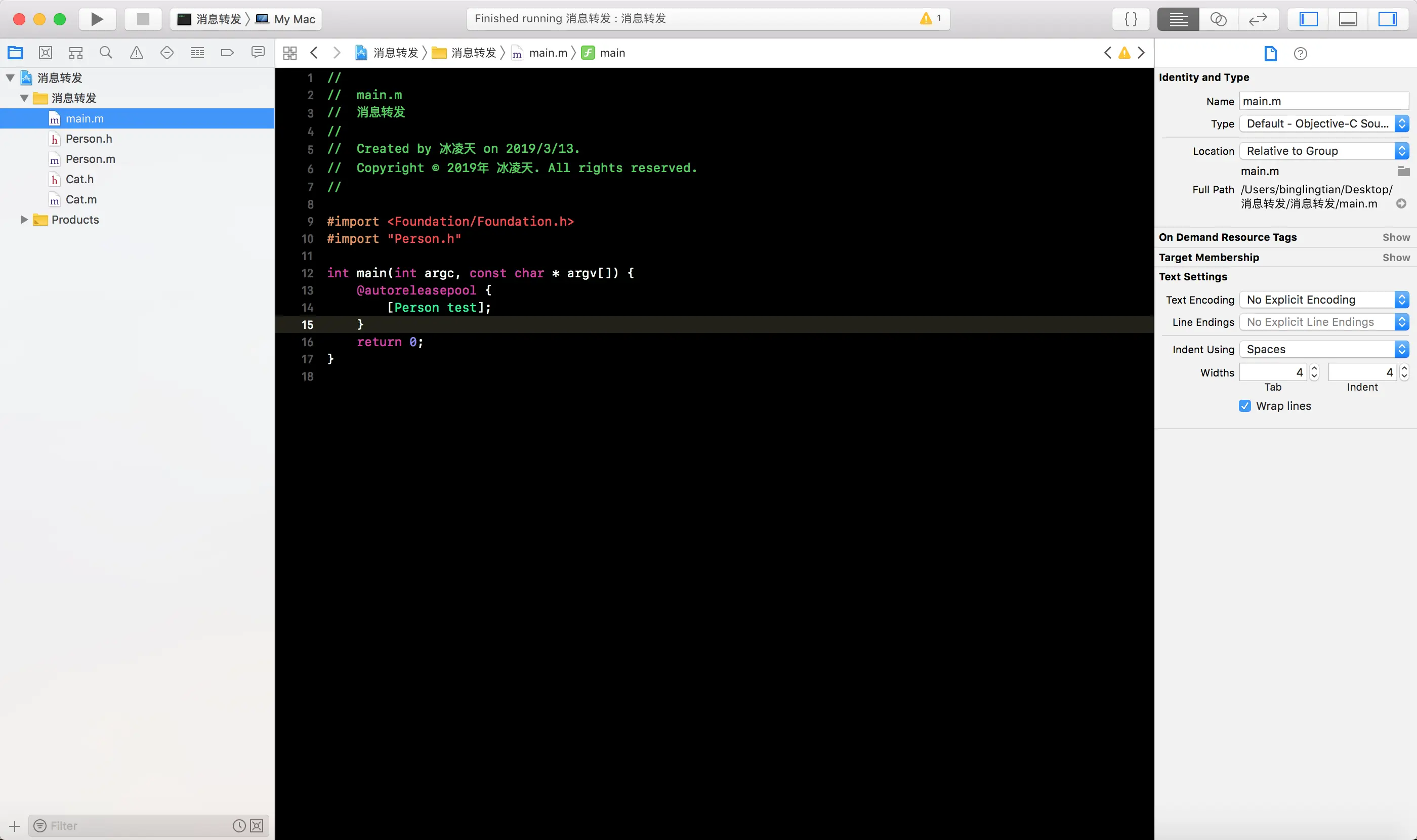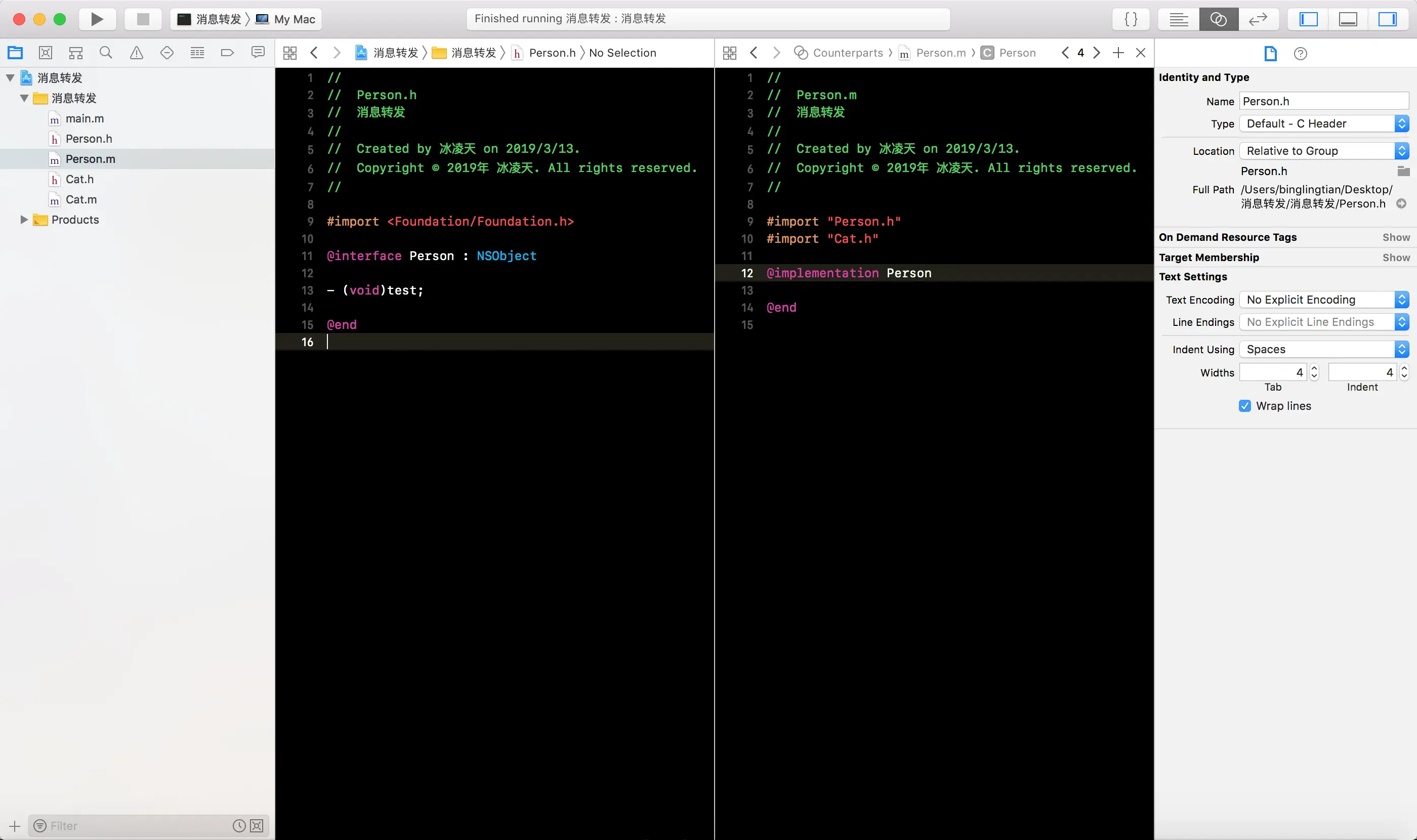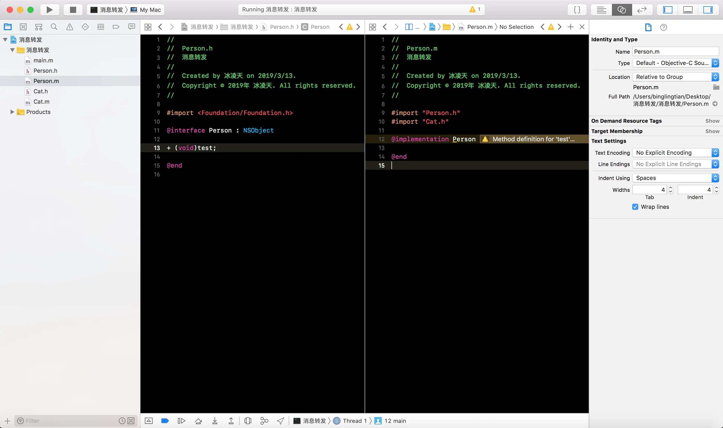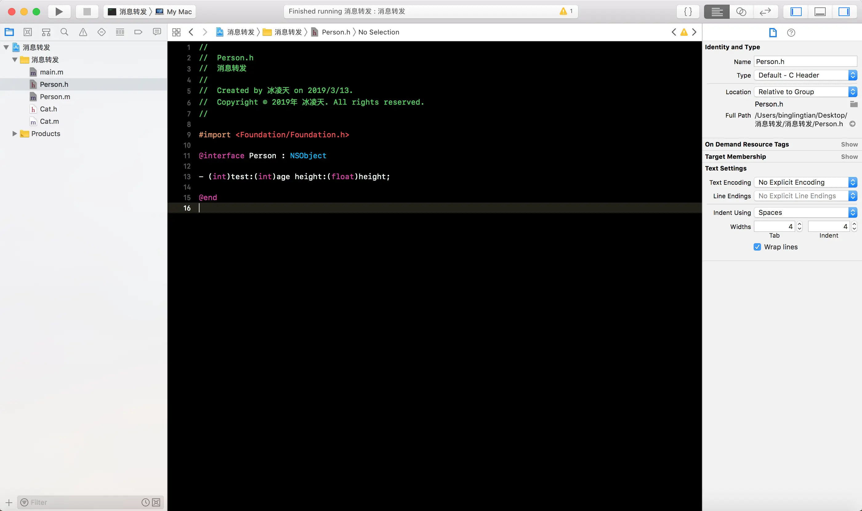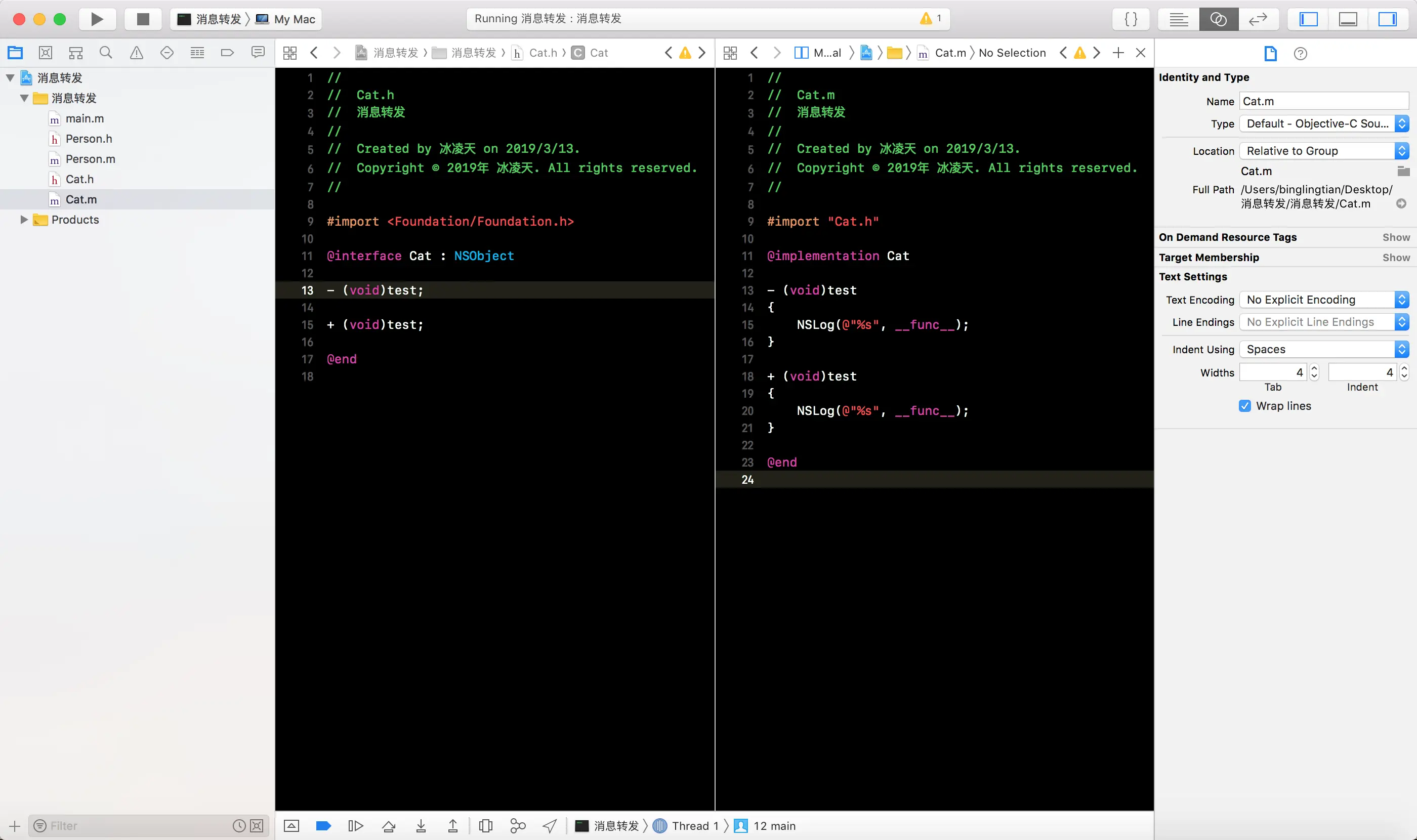 -forwardingTargetForSelector:方法, 将消息接收者编程Cat的一个实例对象, 这样就会白test消息转发给Cat实例对象