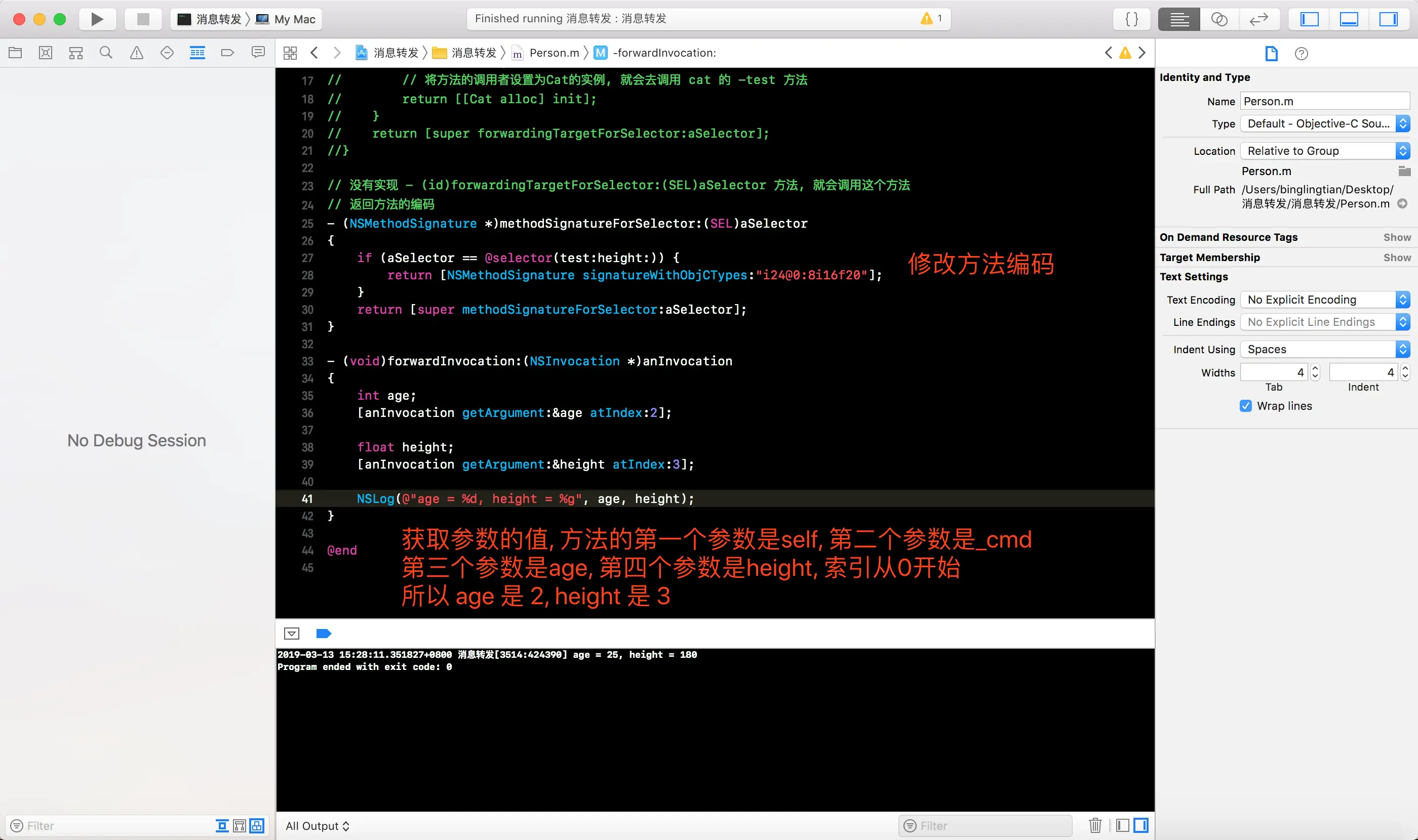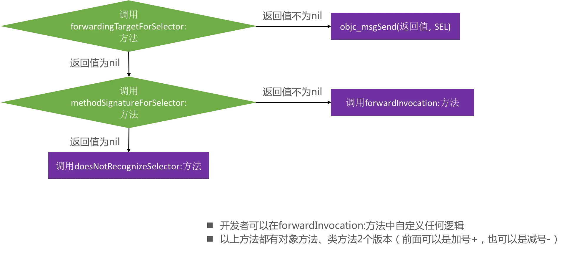 - 上面的例子中展示的是实例方法的消息转发,
