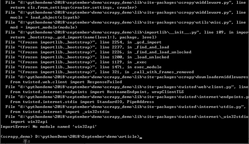 有小伙伴在群里边反映说在使用Scrapy的时候,发现创建项目一切顺利,但是在执行Scrapy爬虫程序的时候却出现下列报错:“No module named win32api”,如下图所示,但是不知道怎么破,今天就这个问题讲解一下解决方案。