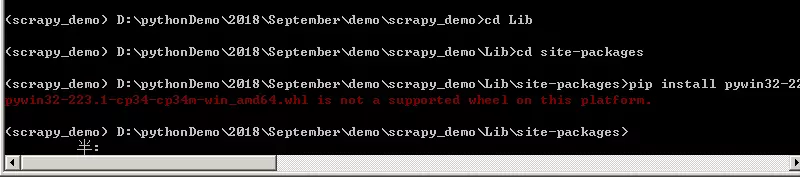 之后执行安装命令“pip install pywin32-223.1-cp34-cp34m-win_amd64.whl”,如下图所示,显示“pywin32-223.1-cp34-cp34m-win_amd64.whlis not a supported wheel on this platform.”,无支持的平台。