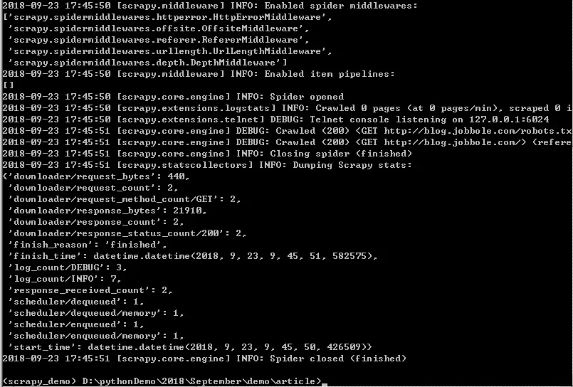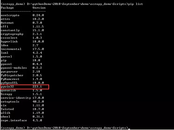 可以看到pywin32已经在里边了,并不是pypiwin32,怀着试一试的心态,再次执行爬虫命令,可以看到不再报这个错误了,竟然解决了这个问题。PS:因为爬虫程序的主题文件还没有任何的逻辑实现,所以返回的pipelines数据为空。