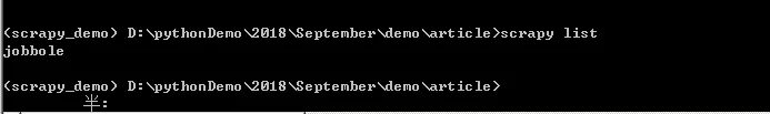 最后安利一个小技巧。最近有的小伙伴在群里问,如果不小心没有记住Scrapy爬虫项目的名字,又不想去Pycharm中进行查看爬虫主体文件,该肿么办?这里介绍一个小技巧,可以帮助你找到爬虫的名字。直接在命令行中输入“scrapy list”即可看到爬虫的名字,如下图所示。