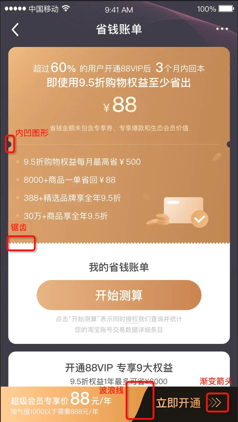 通过渐变和background的组合可以实现很多好玩的效果,模块中的那一行锯齿也是通过的backgorund+渐变实现的。