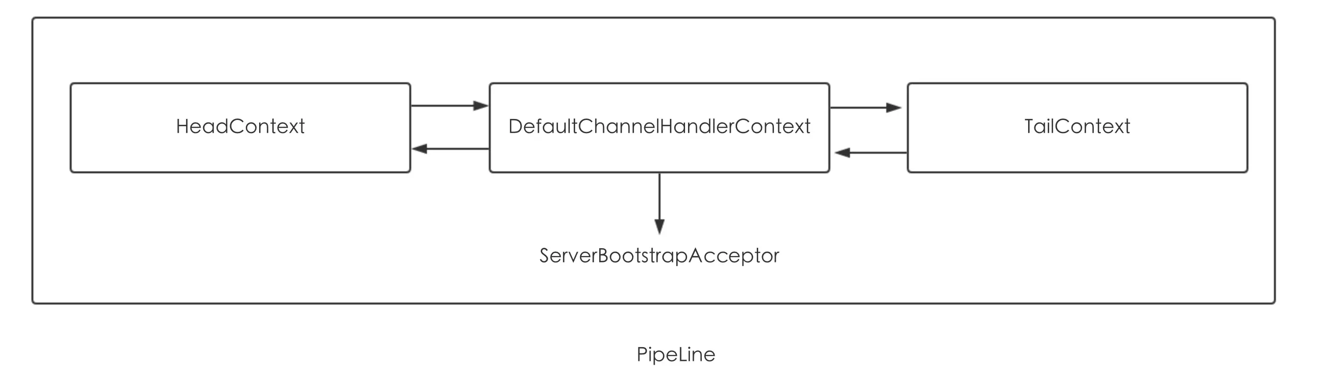 紧接着Netty开始channel的初始化,在NioServerSocketChannel的pipeline最后添加了一个ChannelInboundHandlerAdapter即ServerBootstrapAcceptor,它会执有 childGroup和childHandler,childHandler即用户自定义的channelHandler,而childGroup则是处理请求所用的EventLoop,此时整个pipeline的结构为