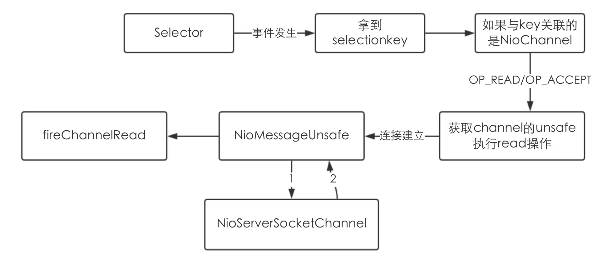 当NioServerSocketChannel绑定了端口之后,NioServerSocketChannel对应的NioEventLoop会等待channel发生事件。整个处理流程如下