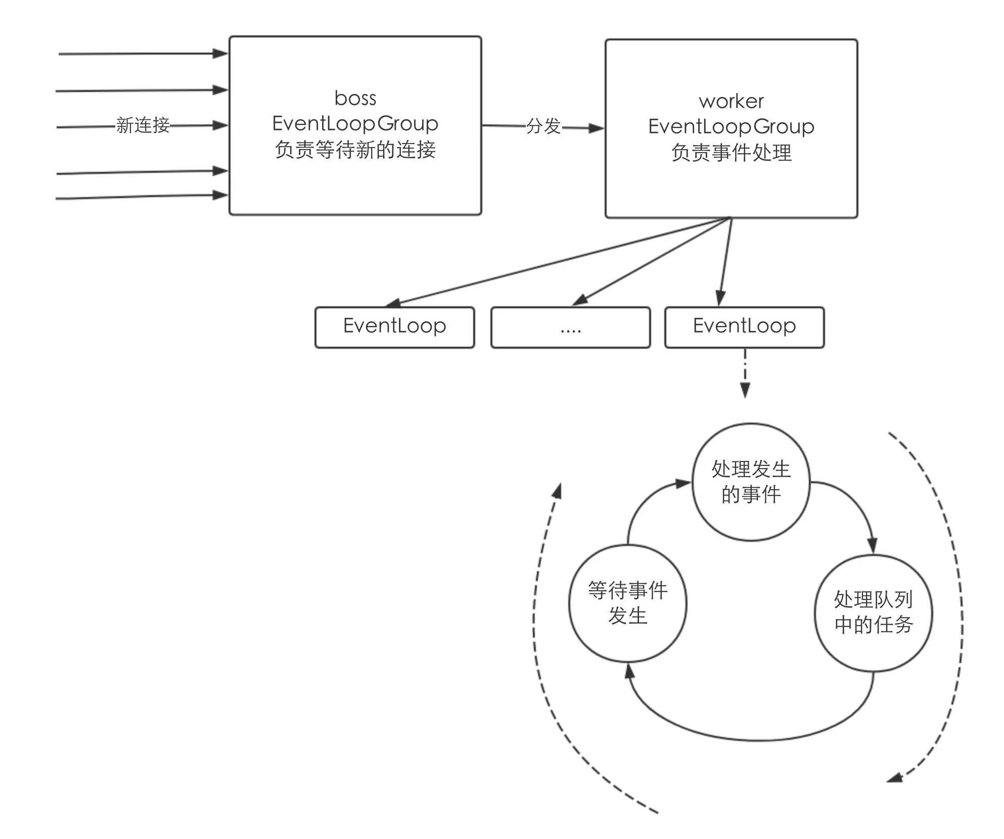 至此可以看到,java nio所需要的准备工作都已经准备好了,剩下的就是等待事件发生以及处理发生的事件。与普通java nio的不同之处在于