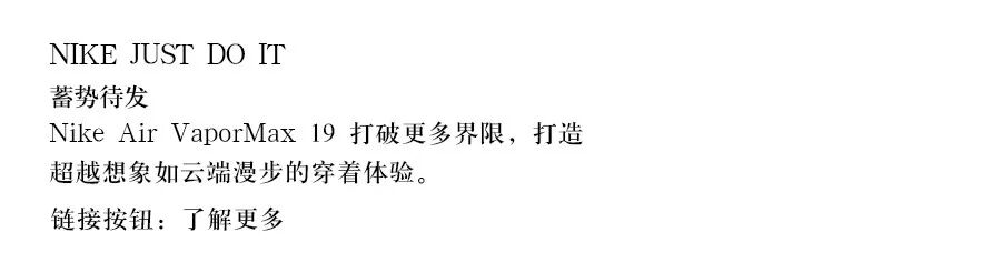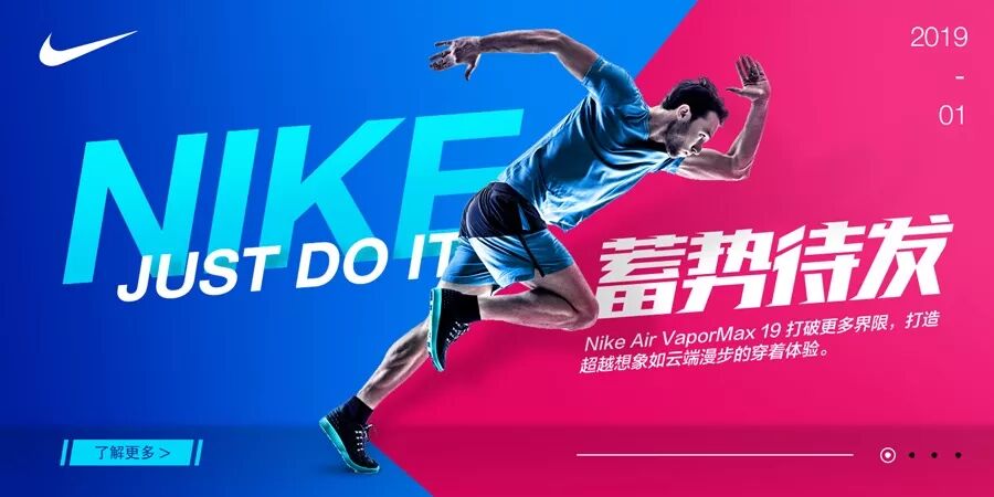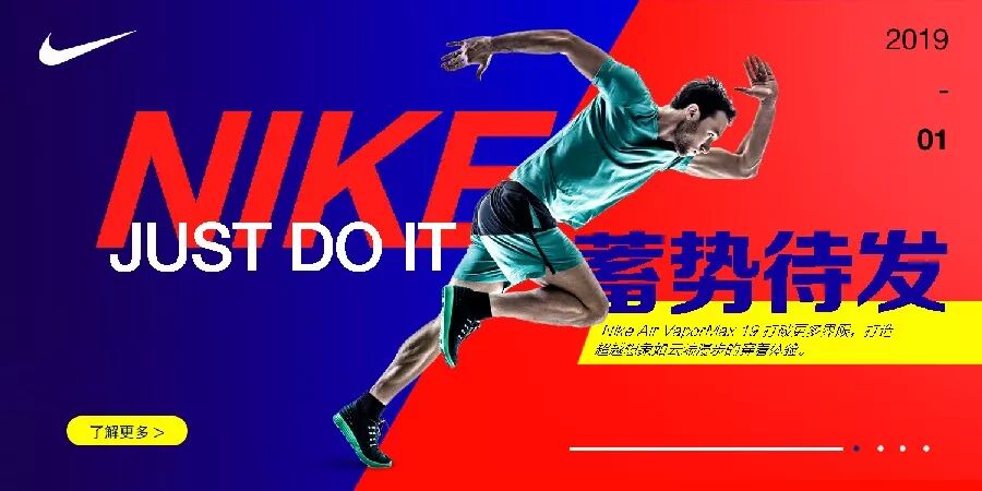 由于有一个动感十足的模特和背景,所以整体看来还是比较符合运动海报的调性,但视觉上有点乱,因为有很多细节没有统一,比如人物倾斜的角度和背景色块、标题倾斜的角度不一样,主要文字的字体风格不一样(NIKE和JUST DO IT的字体比较硬朗,而蓄势待发的字体相对较柔),元素的风格也不统一(圆角的了解更多按钮与整体风格不搭),还有各元素的颜色也缺少联系等等。