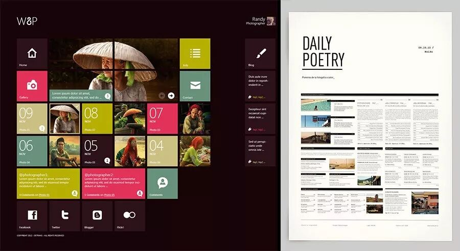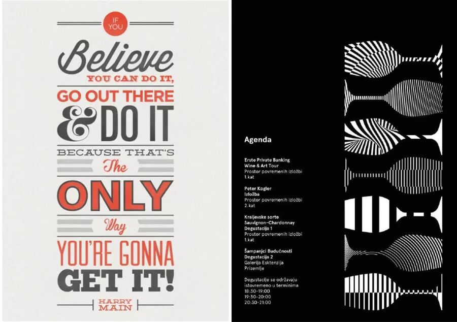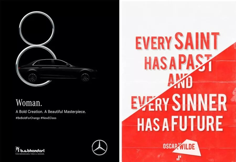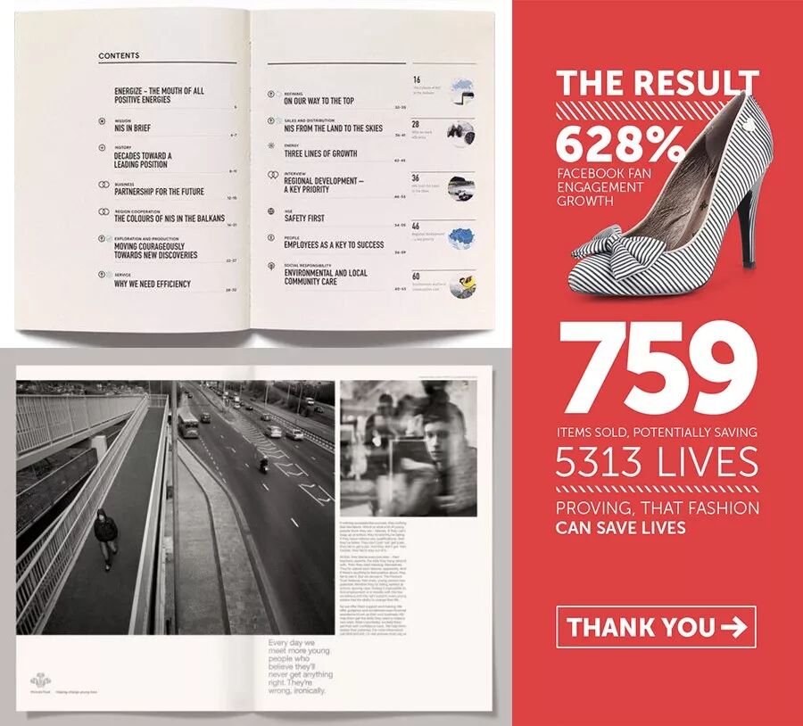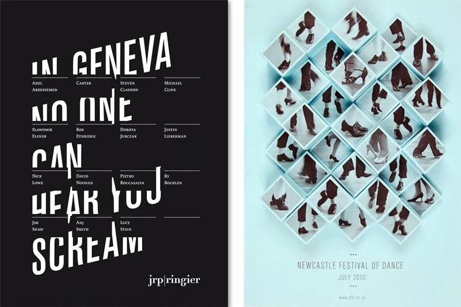 上图很“完美”地执行了对齐原则,整个版面干净、整洁了许多,视觉流程也更简单了。这下总OK了吧,你心想,然而事情并没你想的简单。因为总监不知何时又出现在了你的身后,他瘪着嘴一脸嫌弃地说到:“太呆板了,有点变化好不好?”变化?难道又要调回改之前那种状态啊?当然不是,你其实是要在现有的基础上做一些变化。排版的难点和精妙之处就在这里,既要对齐,又不能机械的对齐,既要整洁有序也要灵活有变化。如何做到这一点呢? 我的理解是:要在对齐中制造一点变化,在变化中找到对齐关系。比如下面这些作品: