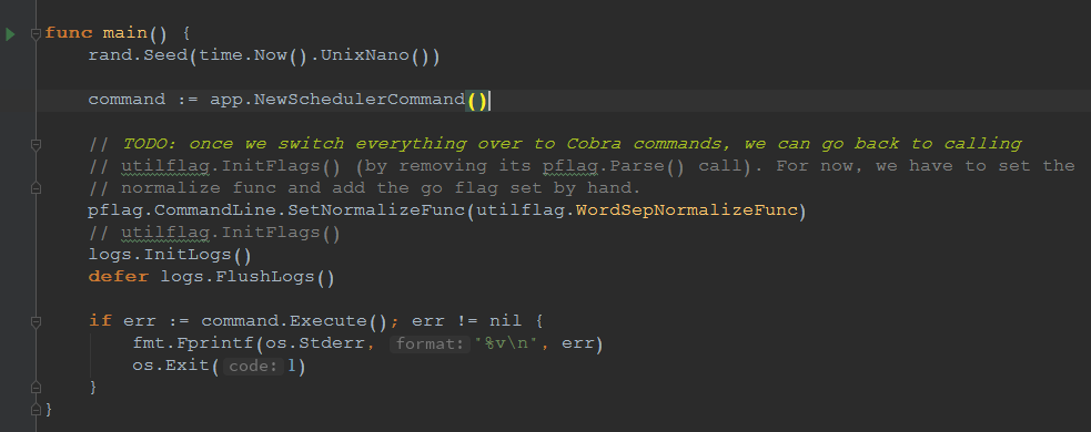 Kubernetes基础组件的入口均在cmd目录下,kube-schduler入口在scheduler.go下,如图