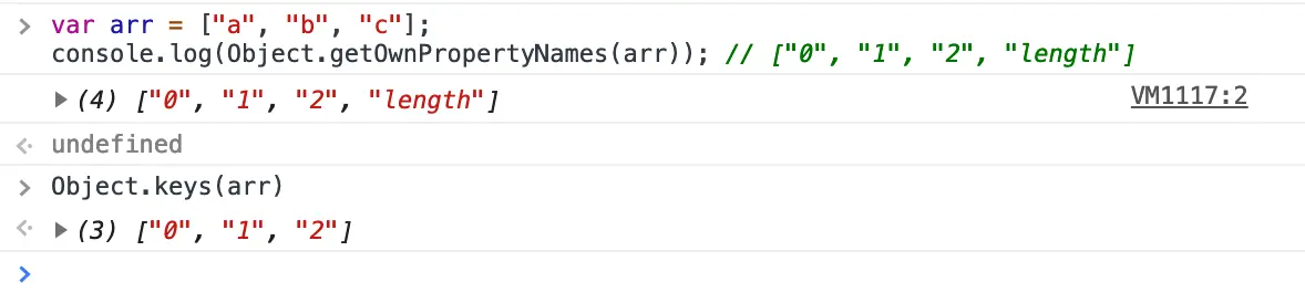 console.log(Object.getOwnPropertyNames(arr).sort()); // ["0", "1", "2", "length"]