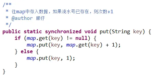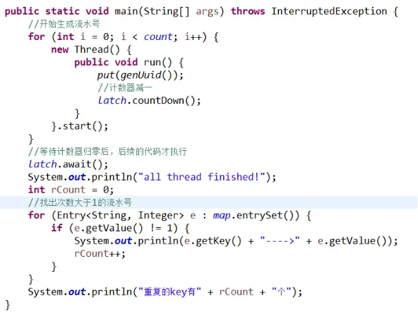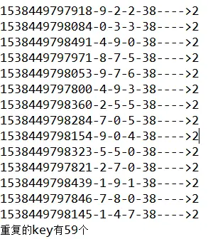循环次数调大后,log输出已无法靠肉眼去看是否重复,需要将每个流水号出现的次数存入Map,最后再看有多少个次数大于1的流水号。代码片段如下: