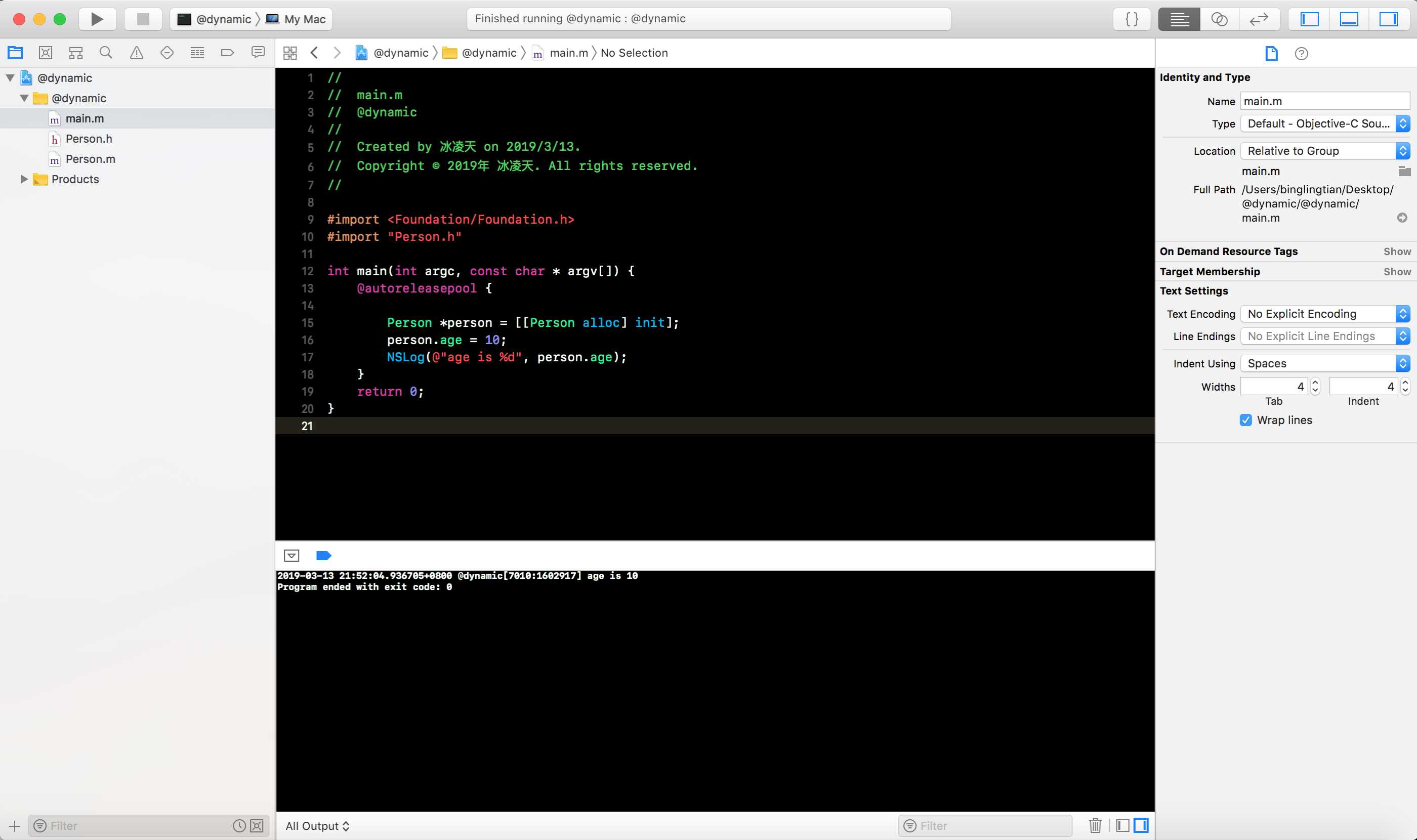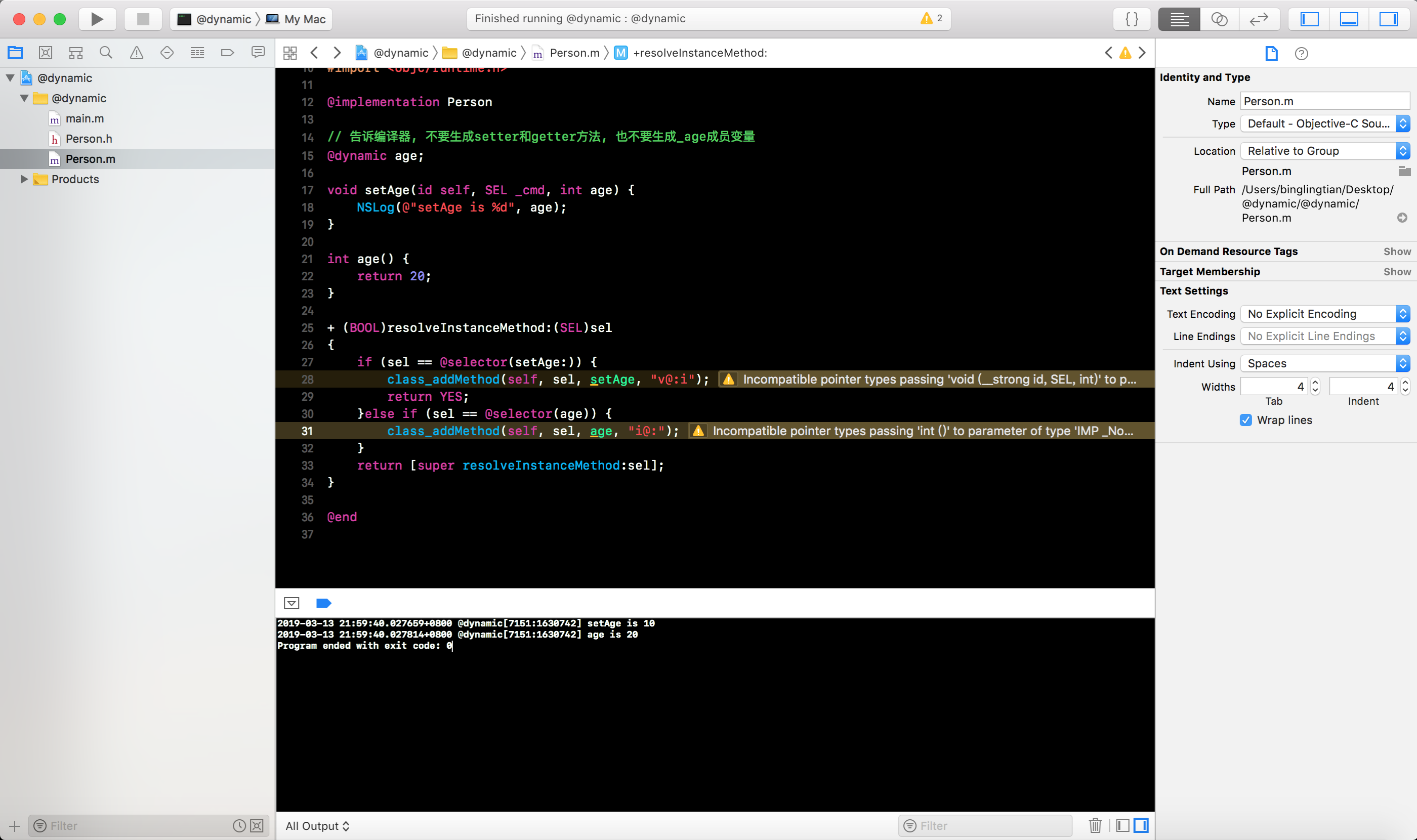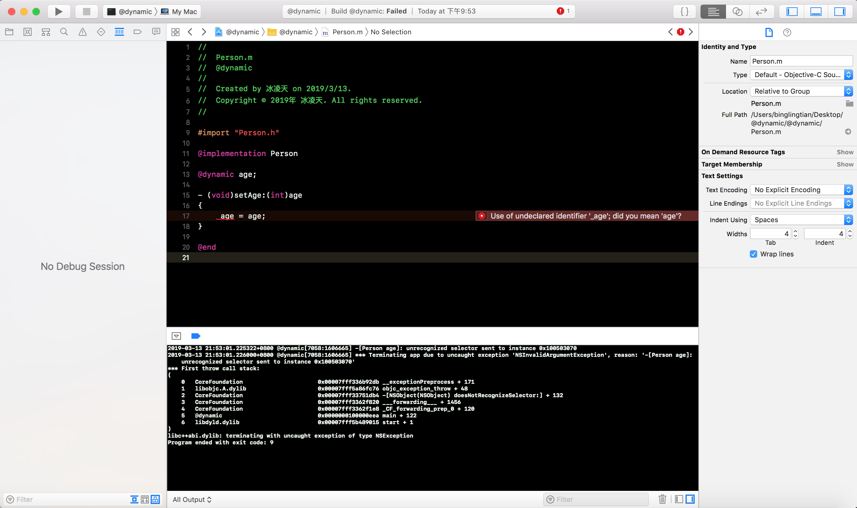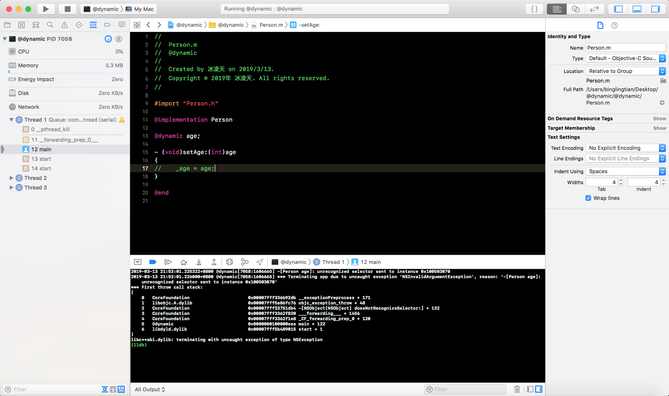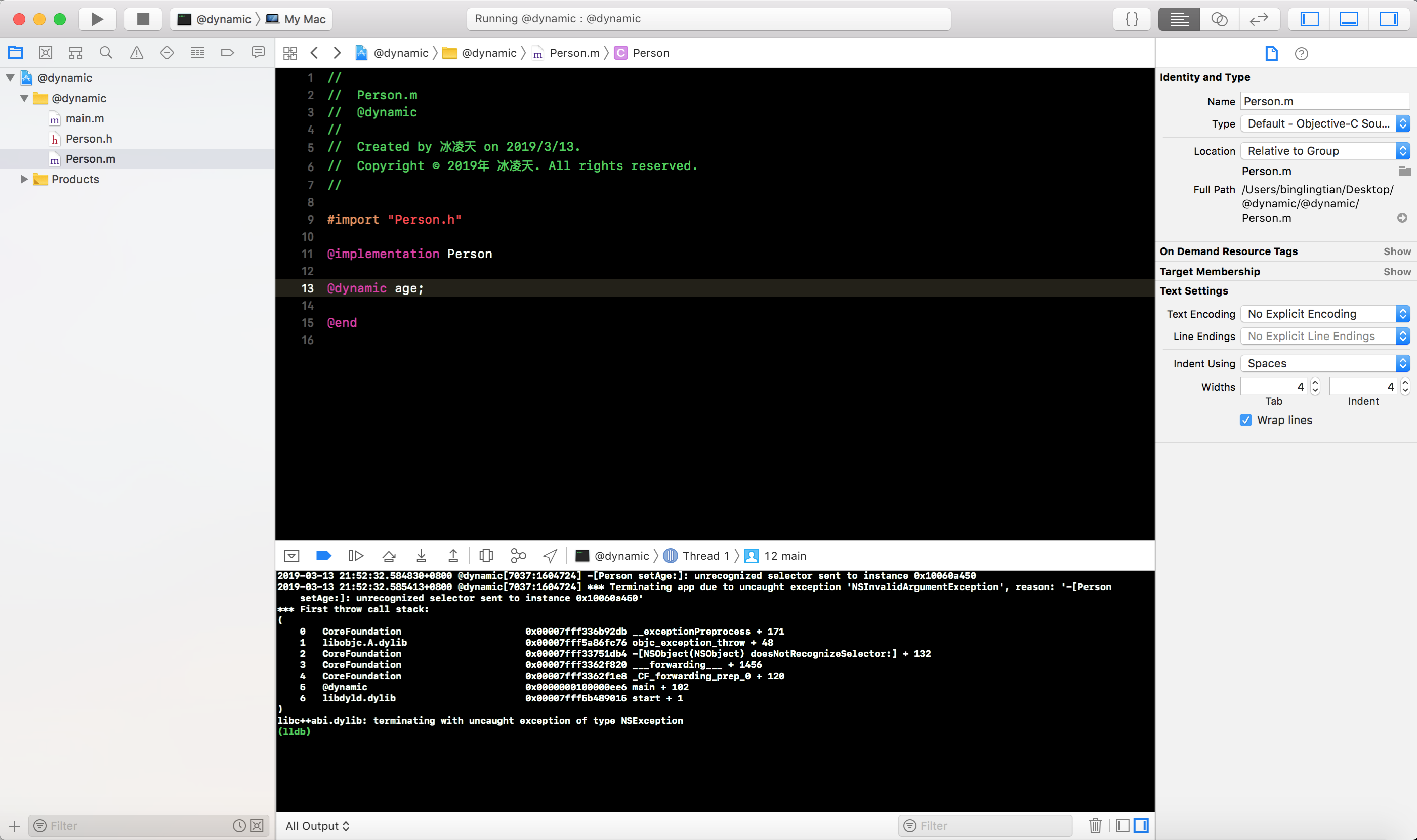 Person.m中添加@dynamic age;, 运行程序 - 可以看到程序发生错误,