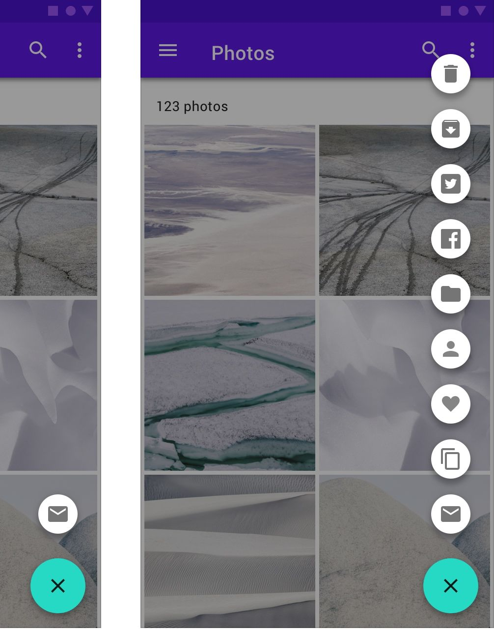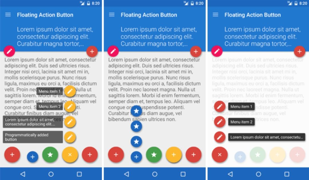FloatingActionMenu: 当我们点击FAB的时候,FAB 能发射出3-6个相关操作的菜单,如果超过了6个或者不足2个菜单,那么就不在适合使用FAB这种方式来实现了。