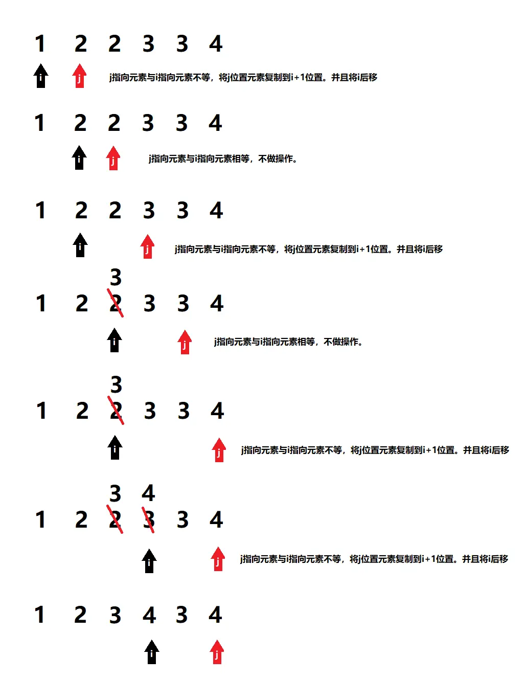 LeetCode每日一题:删除排序数组中的重复项(No.26) 胖宅老鼠 2019-03-13 401 阅读1分钟 题目:删除排序数组中的重复项 给定一个排序数组,你需要在原地删除重复出现的元素,使得每个元素只出现一次,返回移除后数组的新长度。 不要使用额外的数组空间,你必须在原地修改输入数组并在使用 O(1) 额外空间的条件下完成。 示例: 给定 nums = [0,0,1,1,1,2,2,3,3,4], 函数应该返回新的长度 5, 并且原数组 nums 的前五个元素被修改为 0, 1, 2, 3, 4 你不需要考虑数组中超出新长度后面的元素。 思考: 因为是已排序的数组,所以重复的数会连续出现。例如:1,2,2,3,3,4 用两个指针i、j分别指向第0个和第一个元素,然后不断后移j,将其指向的元素分别与i指向的元素比较。 如果相等则不做任何操作,如果不等则将j指向的元素复制到i+1的位置,直到j到数组末尾位置。 实现: public int removeDuplicates(int[] nums) { int i = 0; for (int j = 1; j < nums.length; j++) { if (nums[j] != nums[i]) { i++; nums[i] = nums[j]; } } return i + 1; }