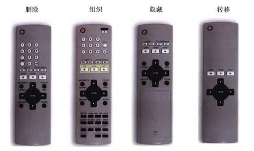 转移-只在遥控器上保留具有最基本功能的按钮,将其他控制转移到电视屏幕上的菜单里,从而将复杂性转移到电视。