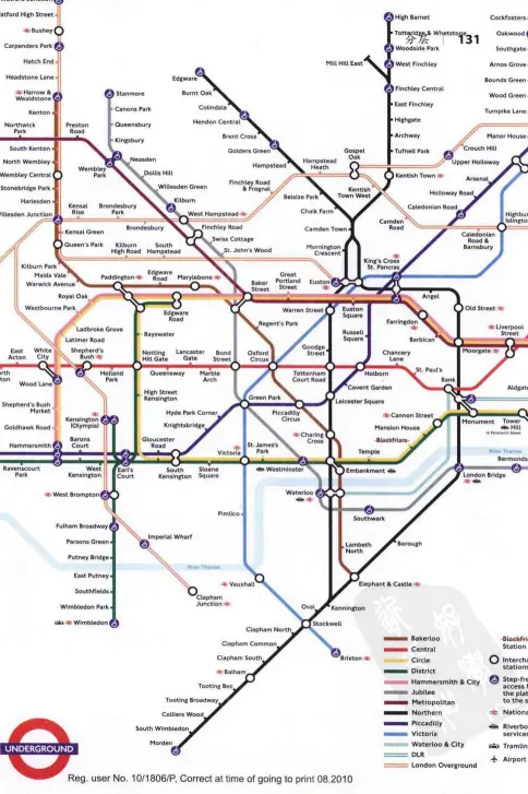 伦敦地铁图包含了13条线300多个站点,为了防止信息混乱不清,使用了一种名为感知分层的技术,每条线路都用一种不同的颜色表示,人们在无意的状态下,只会感知自己关心的那条线路的颜色,将其他线路排除在意识之外,尽管各条线路交叉纵横。