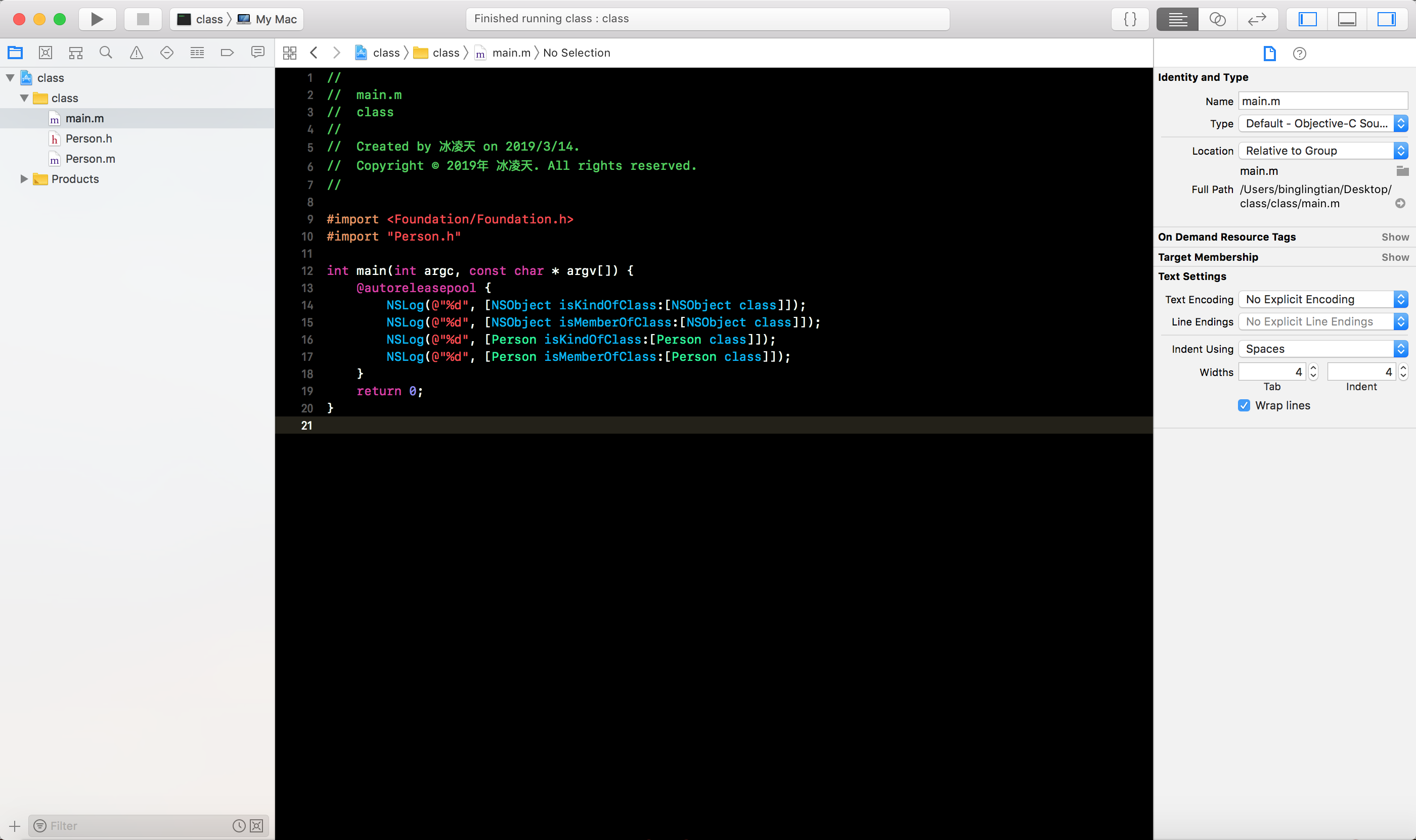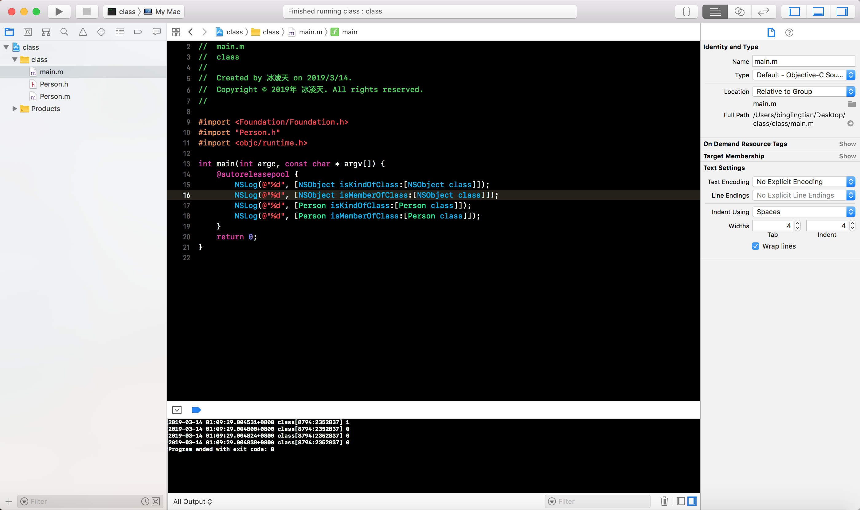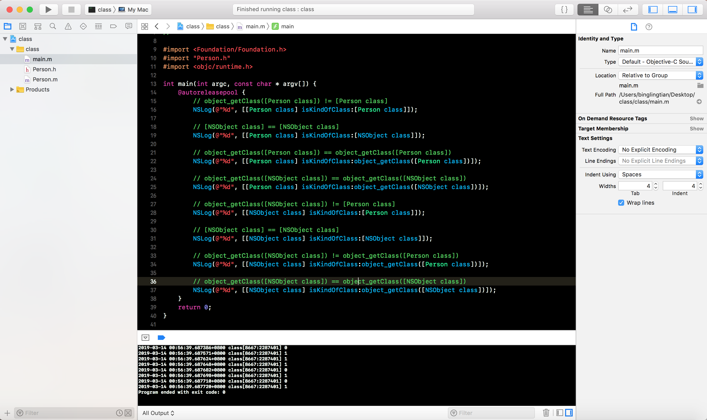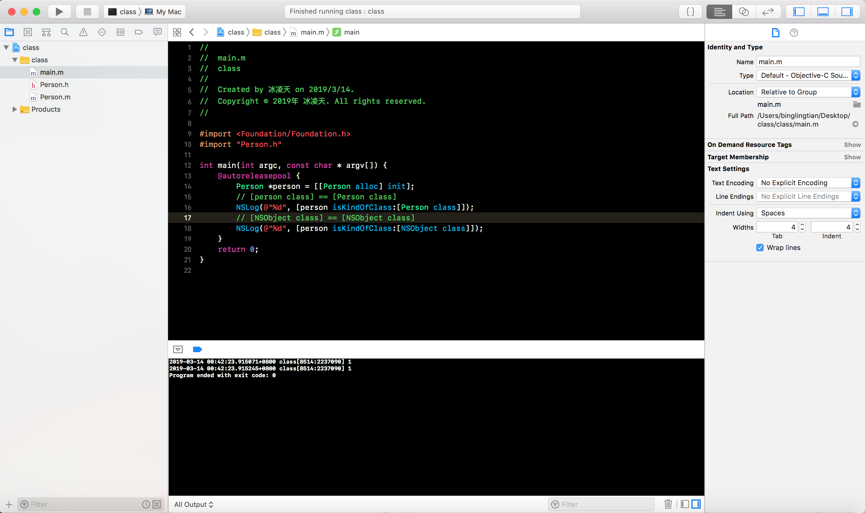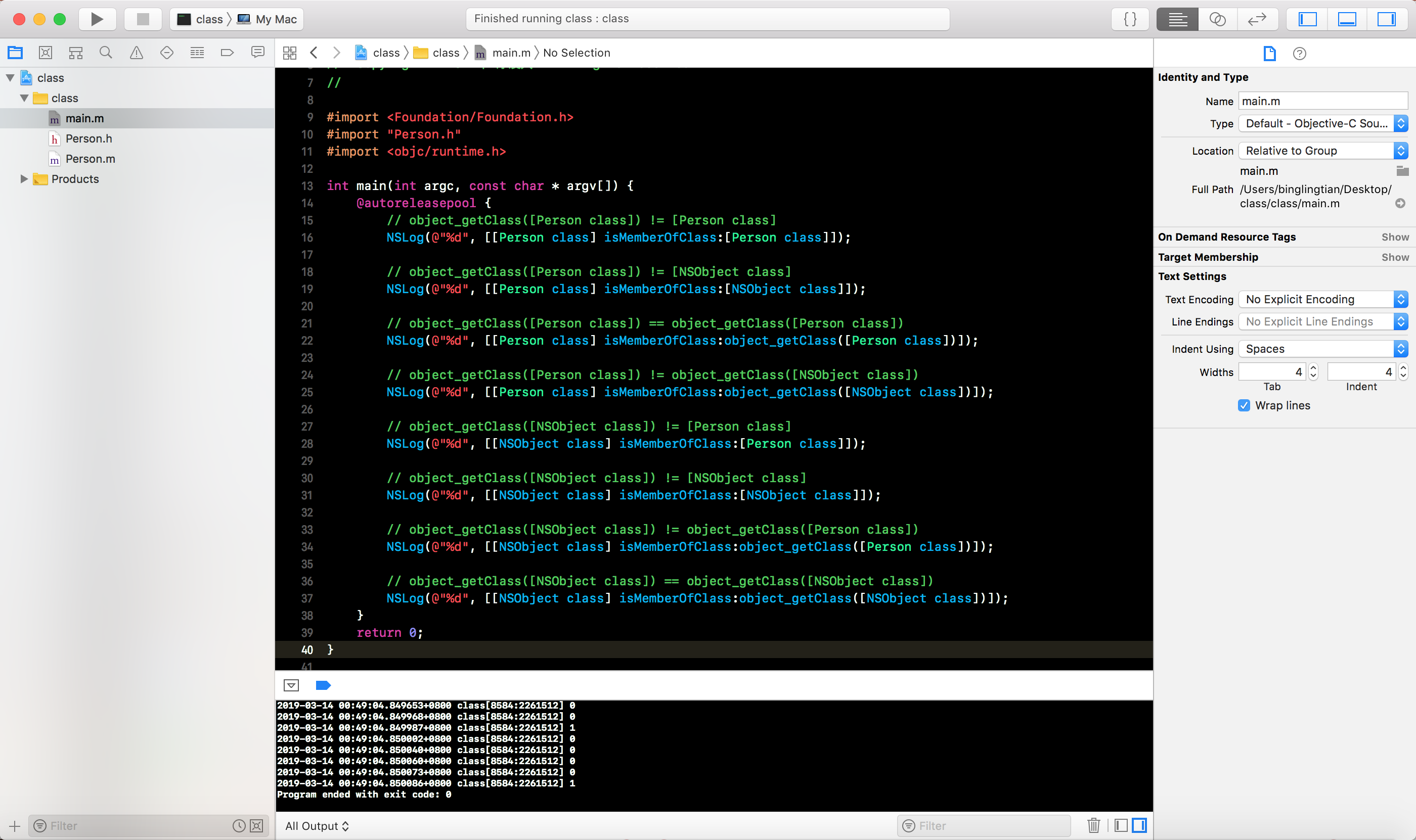 NSLog(@"%d", [Person isMemberOfClass:[Person class]]);