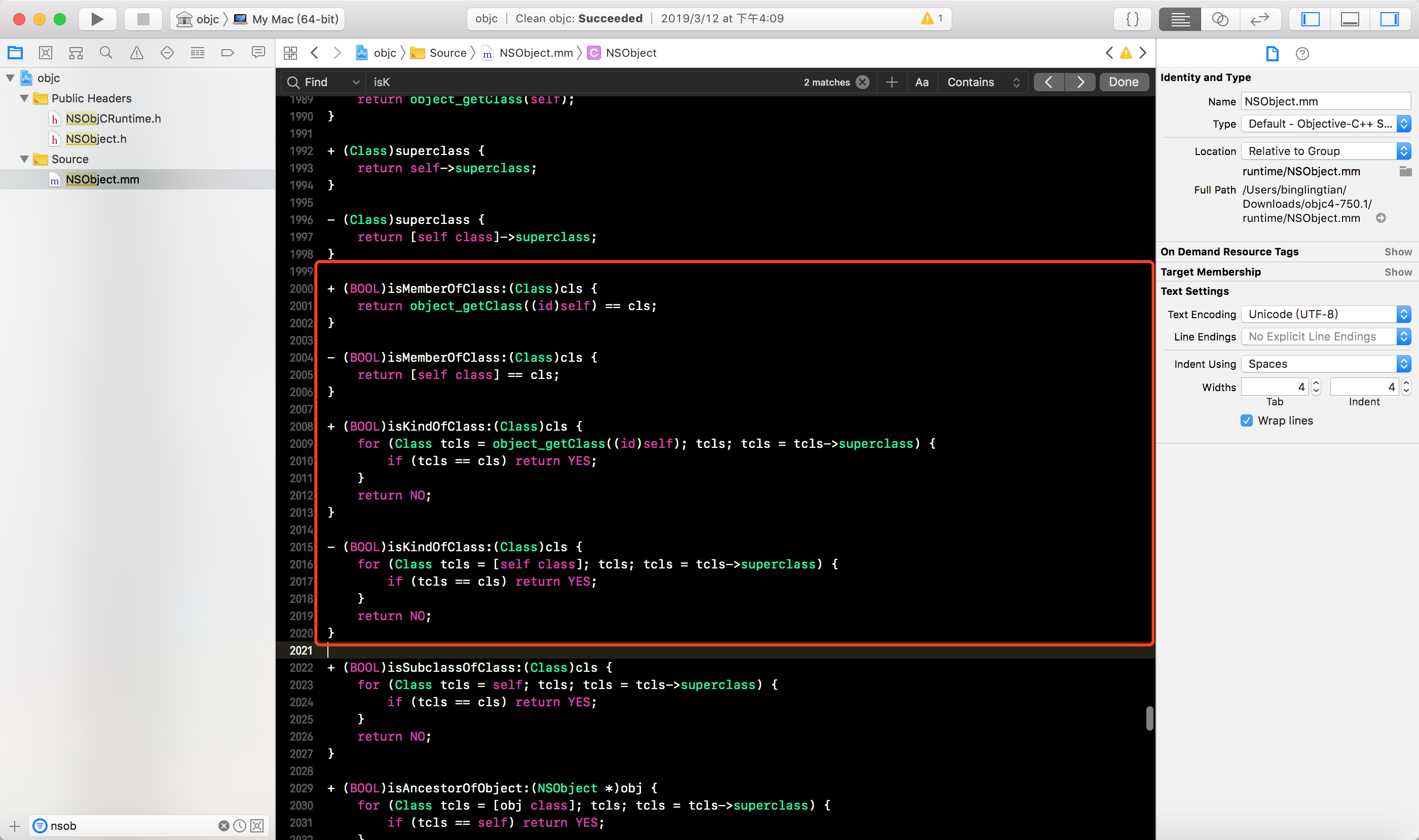 isKindOfClass:和isMemberOfClass:两个方法, 底层代码是开源的