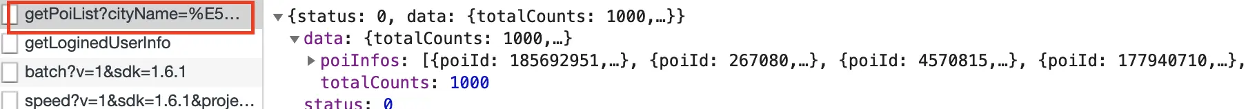 以美团为例,点进美团的美食页面,使用f12打开开发者工具。清空当前产生的各种请求,然后点击下一页,会发现重新生成大量的请求。切换到xhr页面观察是否通过ajax进行的请求,我们发现getPoiList开头的请求返回了我们需要的结果。