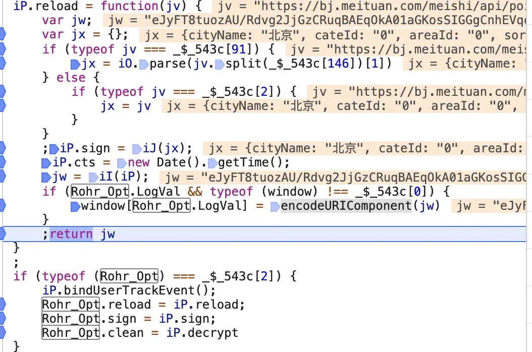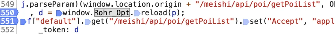 我们可以看到,根据getPoiList我们找到了_token的的值为d,d又是通过Rohr_Opt.reload(p)方法进行加密得到想要的结果的。