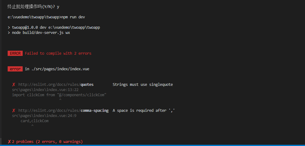 使用mpvue时,npm run dev一直报代码编辑格式的错误如何处理?,如何关闭eslint规范? 小孙的代码敲给你来看 2019-03-14 932 阅读1分钟 当我创建mpvue项目时,一般都是路回车创建完成,使用的时候,可能会因为一个空格都会引起报错,这就是eslint代码规范引起的,例如: 我们将eslint 规范的代码删掉或者注掉,就可以解决类似代码规范的报错: 这样代码就可正常运行了! 希望可以帮助到大家!有什么问题可以给我留言,尽量帮大家解决;