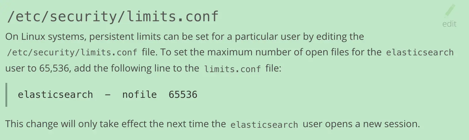 参加官网文档链接(https://www.elastic.co/guide/en/elasticsearch/reference/current/setting-system-settings.html#limits.conf)