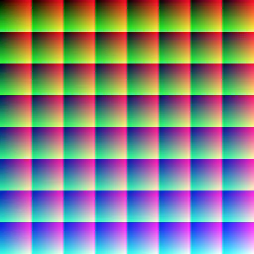上图中的lut图片是一张宽512像素、高512像素的正方形图,它的x轴和y轴分别有8个大格子。那么就可以算出,每个大格子的宽和高分别有64个像素。