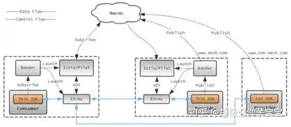 图中同时示例了 mesh 下的 Consumer 能同时调用 mesh 下的服务(图中以 www.mesh.com 域名做示例)和非 mesh 下的服务(图中以 www.non-mesh.com 域名做示例)。闲鱼落地的场景为了避免对 20 多个依赖服务进行改造,流量走的是 mesh 下的 Consumer 调用非 mesh 下的 Provider 这一形式,读者可以理解为图中最左边的容器部署的是 Dart 服务端,它将调用图中最右边容器所提供的服务去实现业务逻辑。
