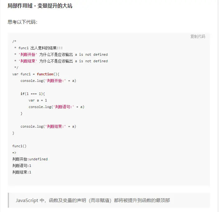 JavaScript中,变量的声明(而非赋值)都将被提升到函数的最顶部。